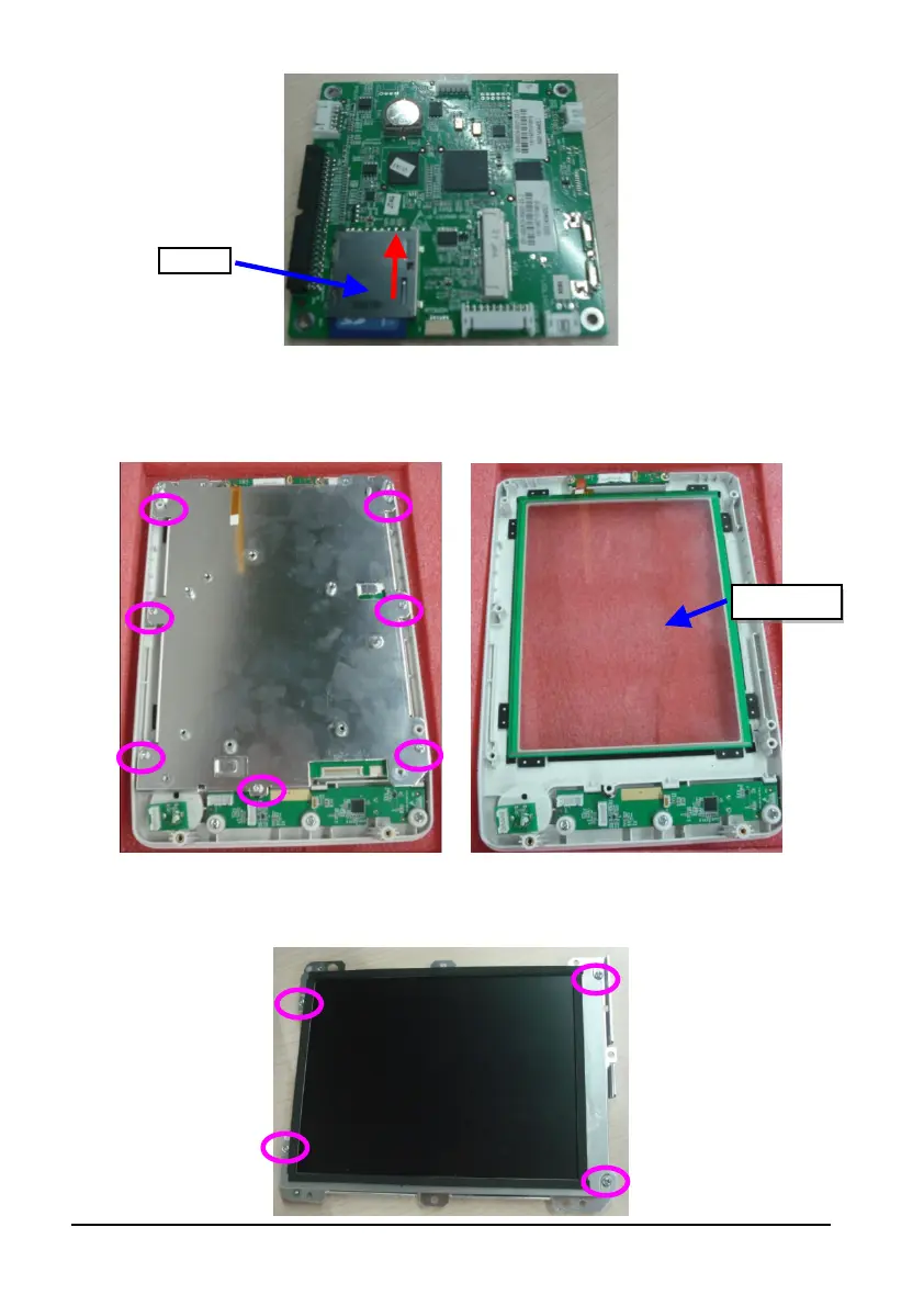 Unscrew the seven PT3×8 screws as indicated below. Remove the touchscreen assembly