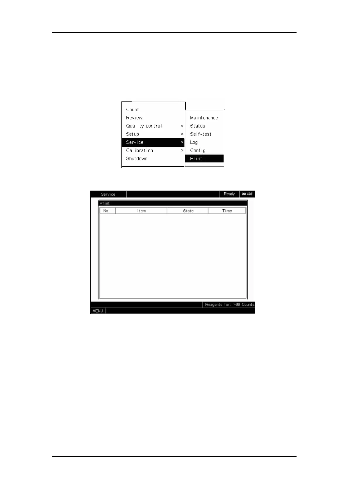 Press the [MENU] to enter the system menu and SELECT “Service→Print.” , as Figure