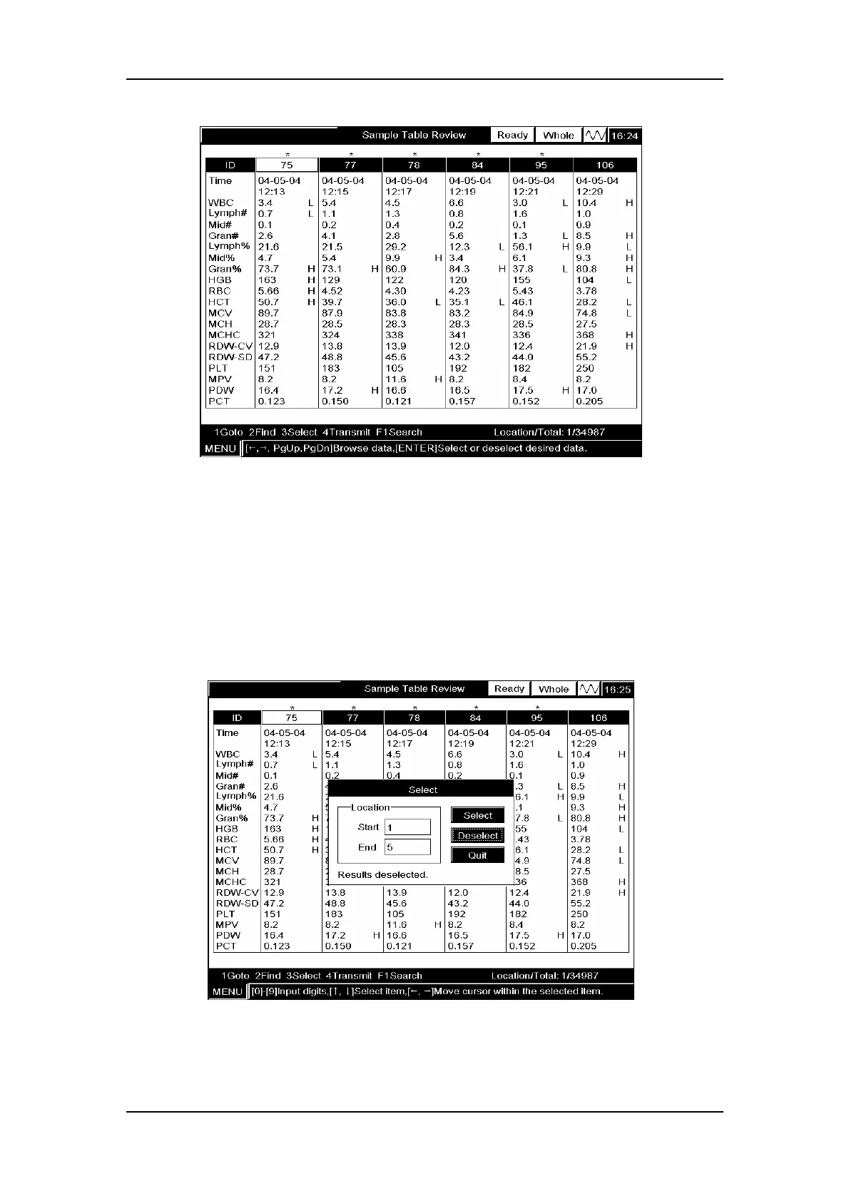 Example2:To deselect the sample results of locations 1 – 5 (sample ID: 75, 77, 78, 84, 95 in