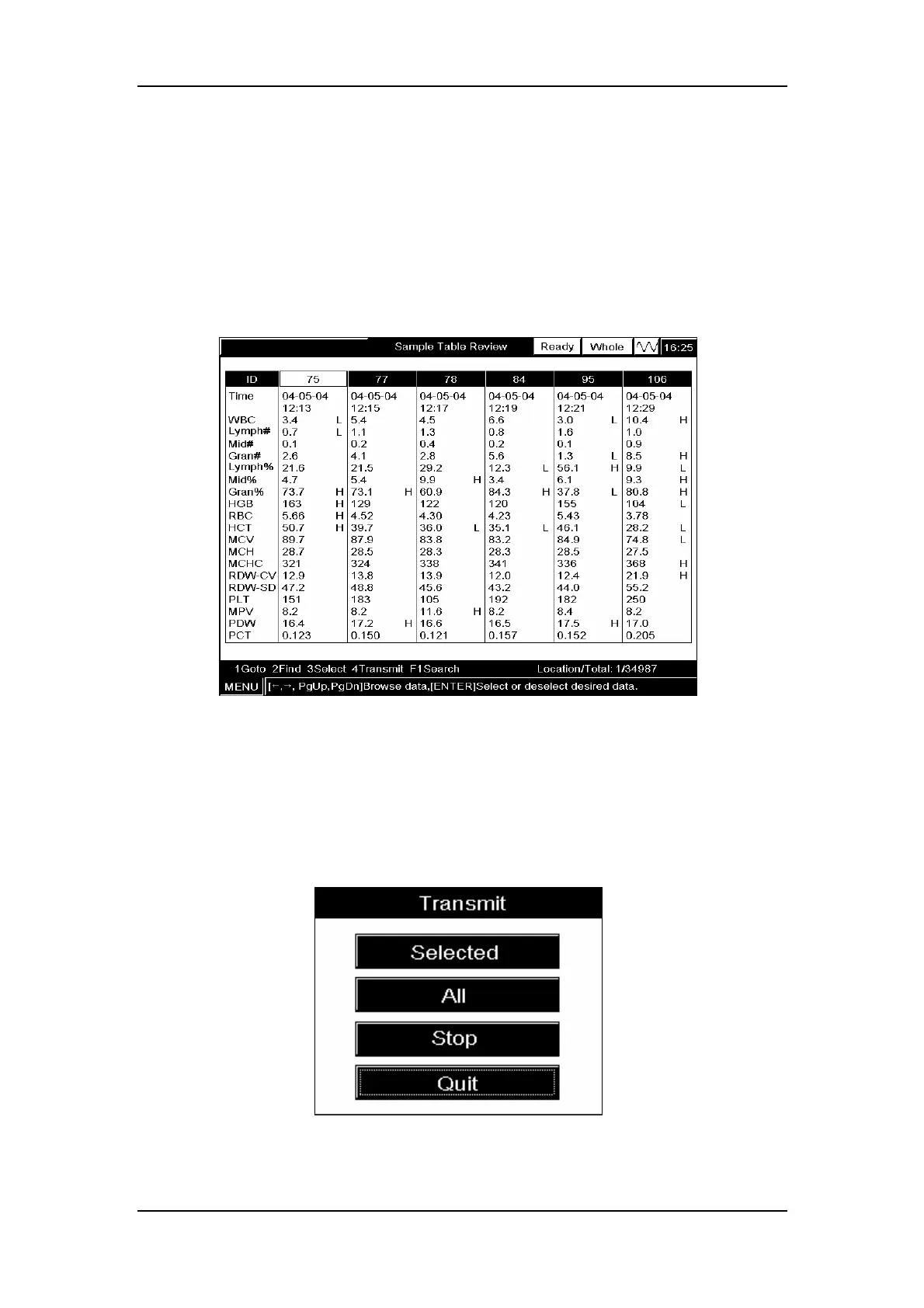 You can transmit the selected or all sample results to an external computer (a host). Press [4]
