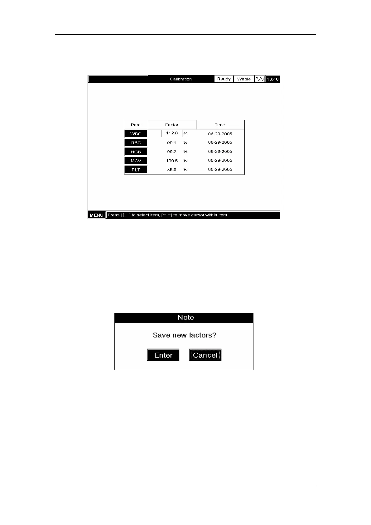 CLICK ”Enter” to save the new calibration factors to the “Manual Calibration” screen and