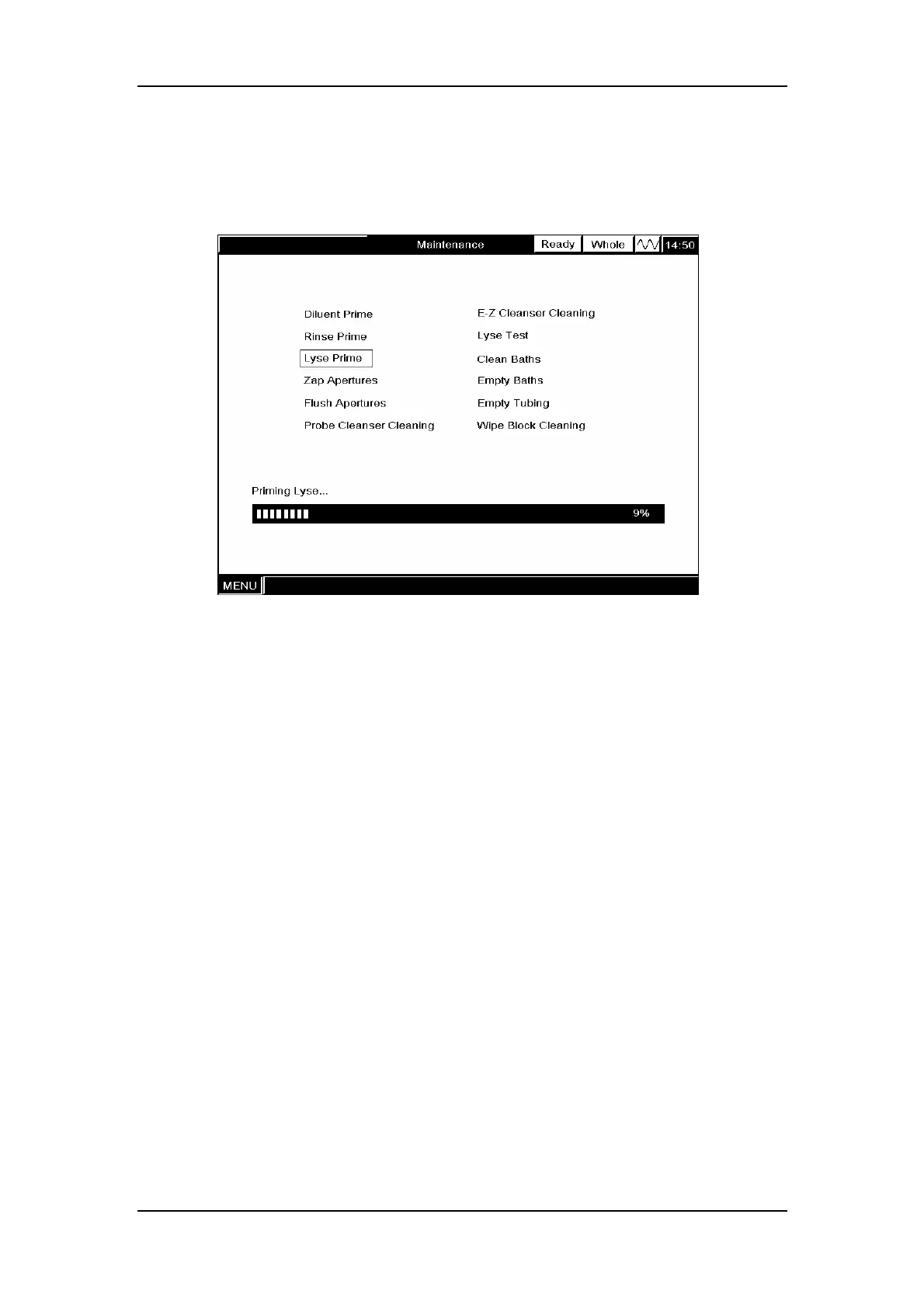 At the “Maintenance” screen, SELECT “Lyse Prime” to prime the tubing with lyse and the