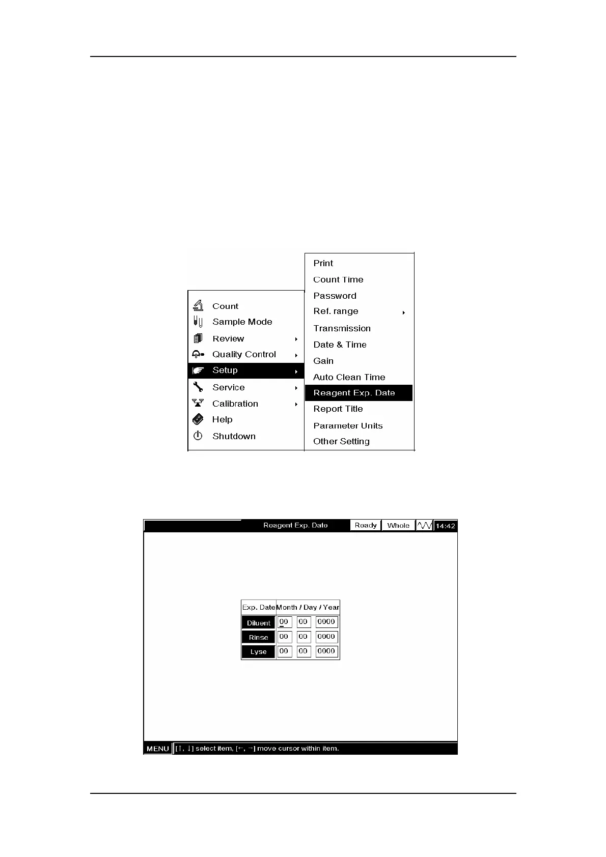 SELECT ” Setup→ Reagent Exp. Date” (Figure 5-37) to enter the ”Reagent Exp. Date”