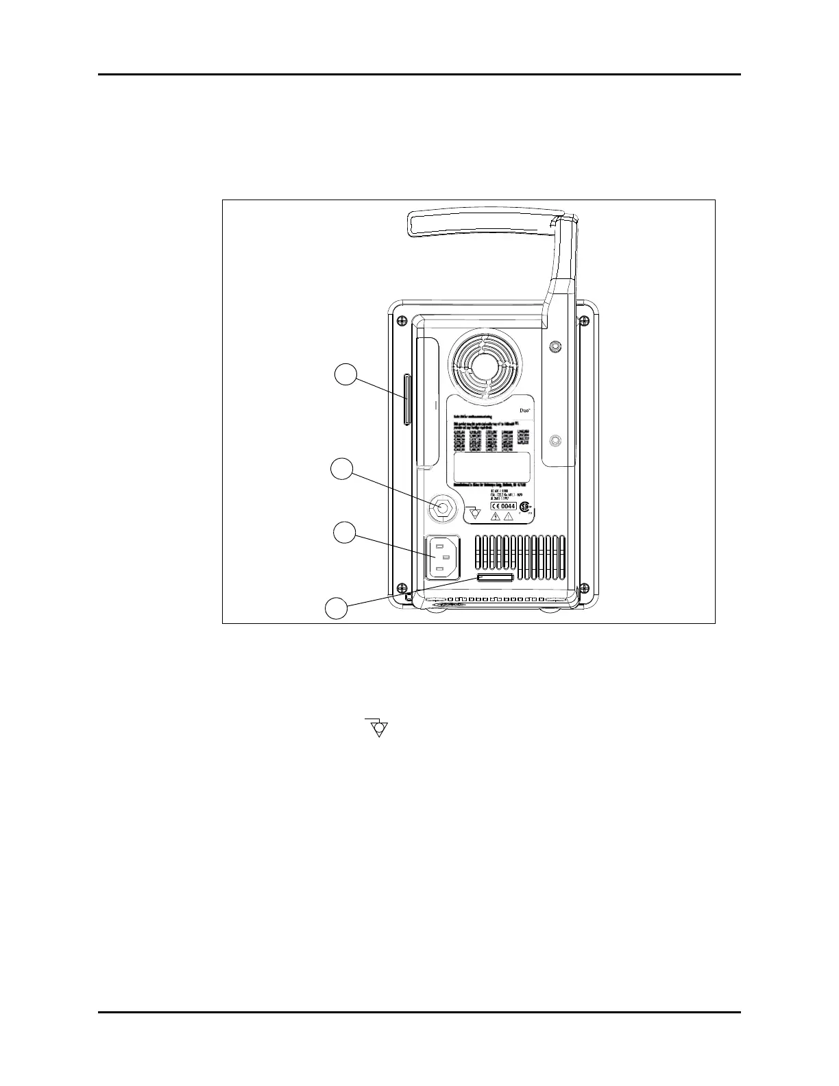 The rear panel provides a general information label, a serial port, an equipotential lug, an