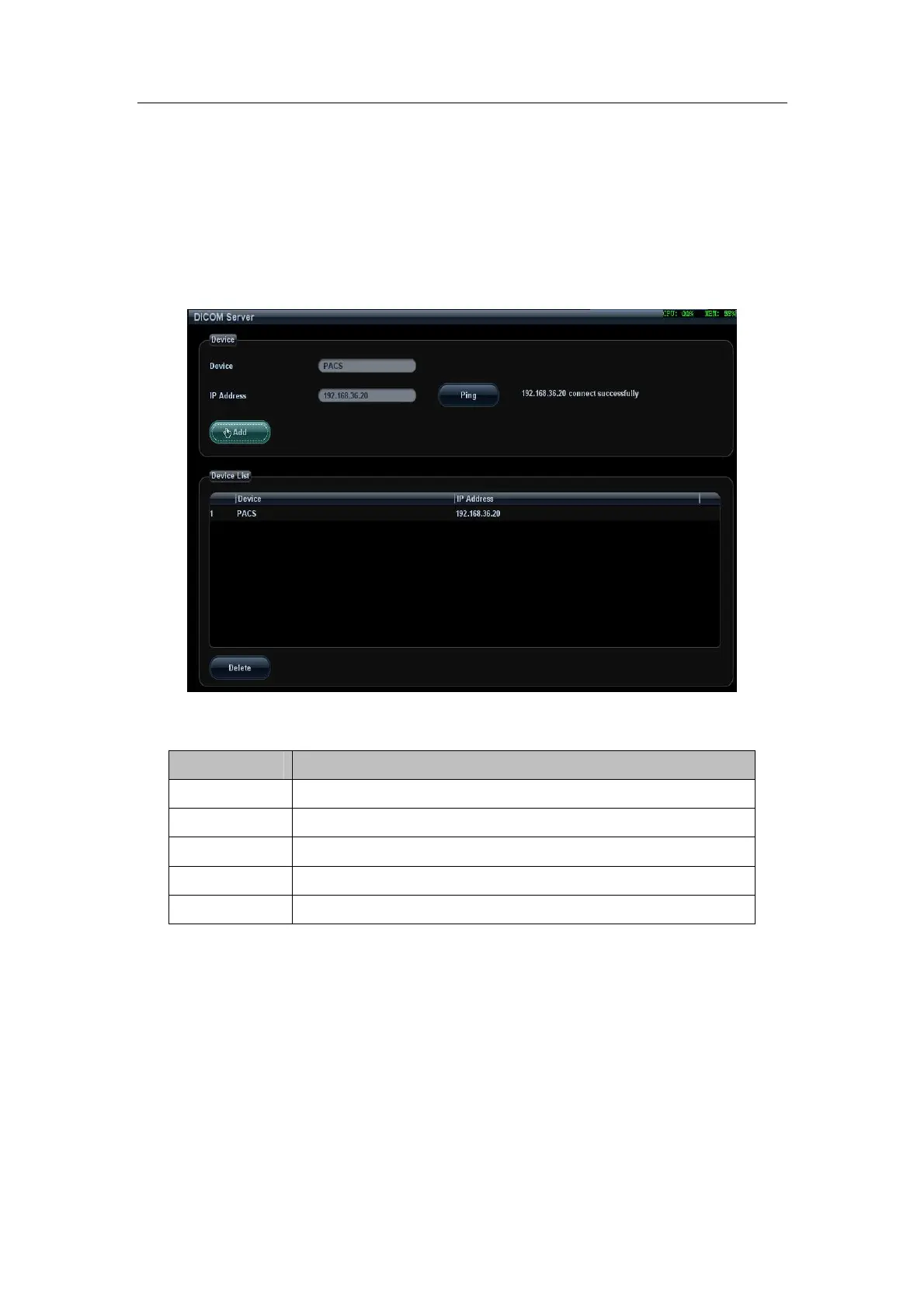 The DICOM Server screen is used to add or delete DICOM servers, or set IP address for