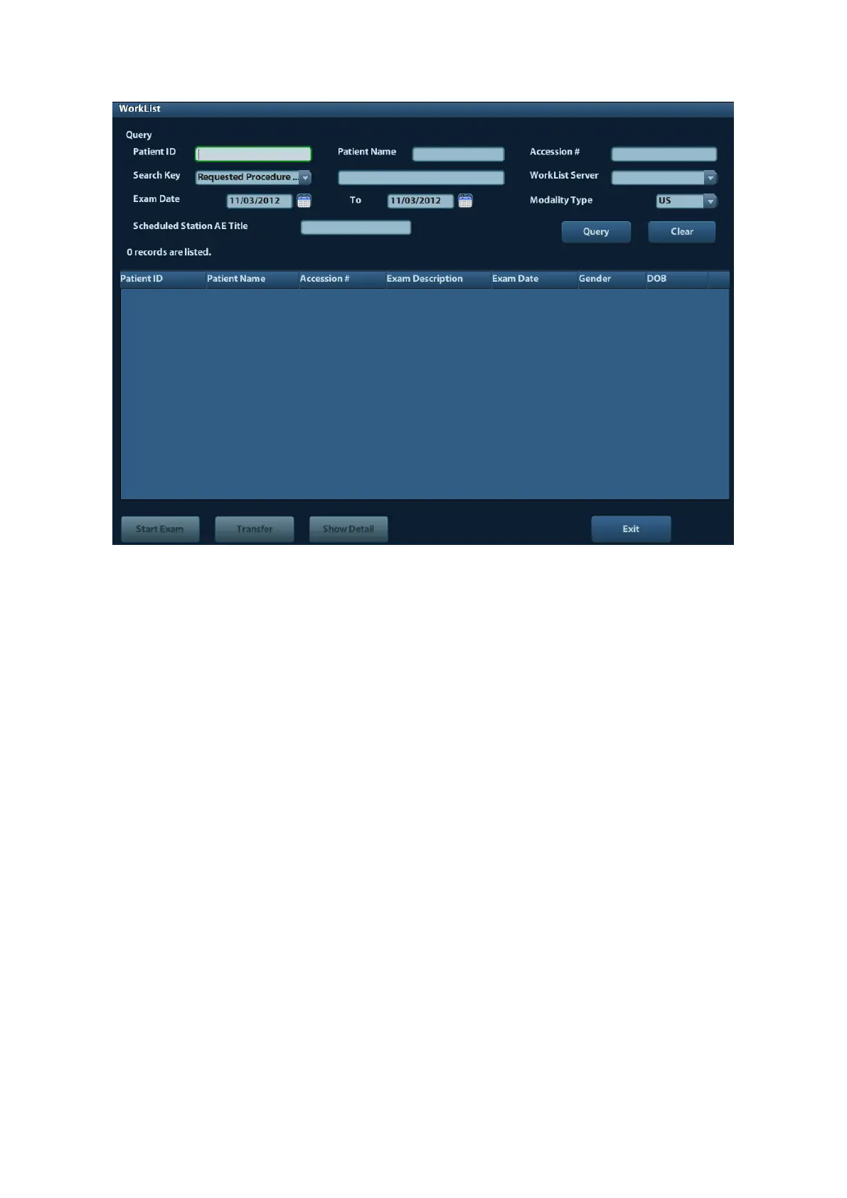 Worklist Server or Exam Date. The default exam date is the current date.