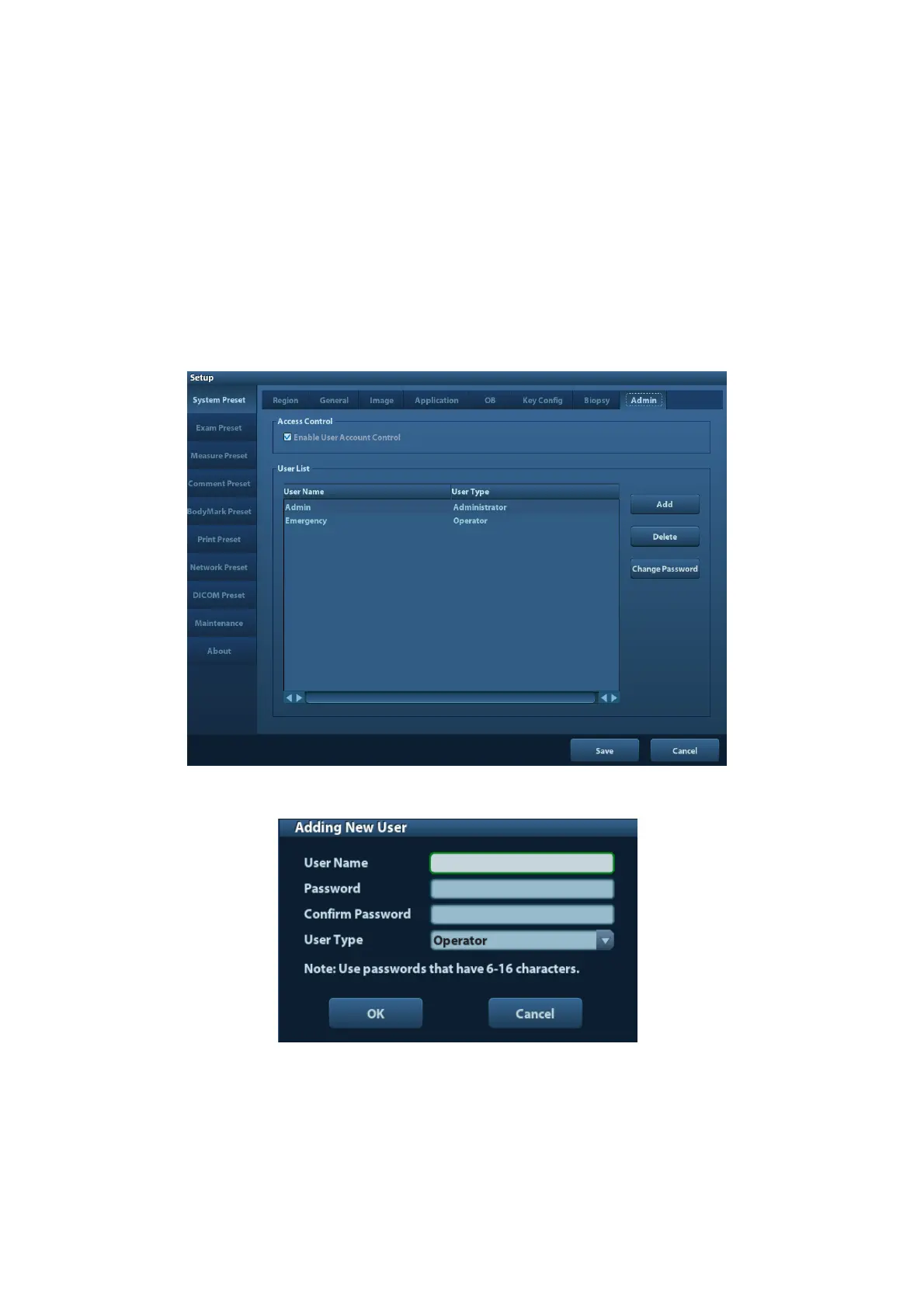 1. Open the “Admin” page through the path: [Setup]→[System Preset]→[Admin]. See the