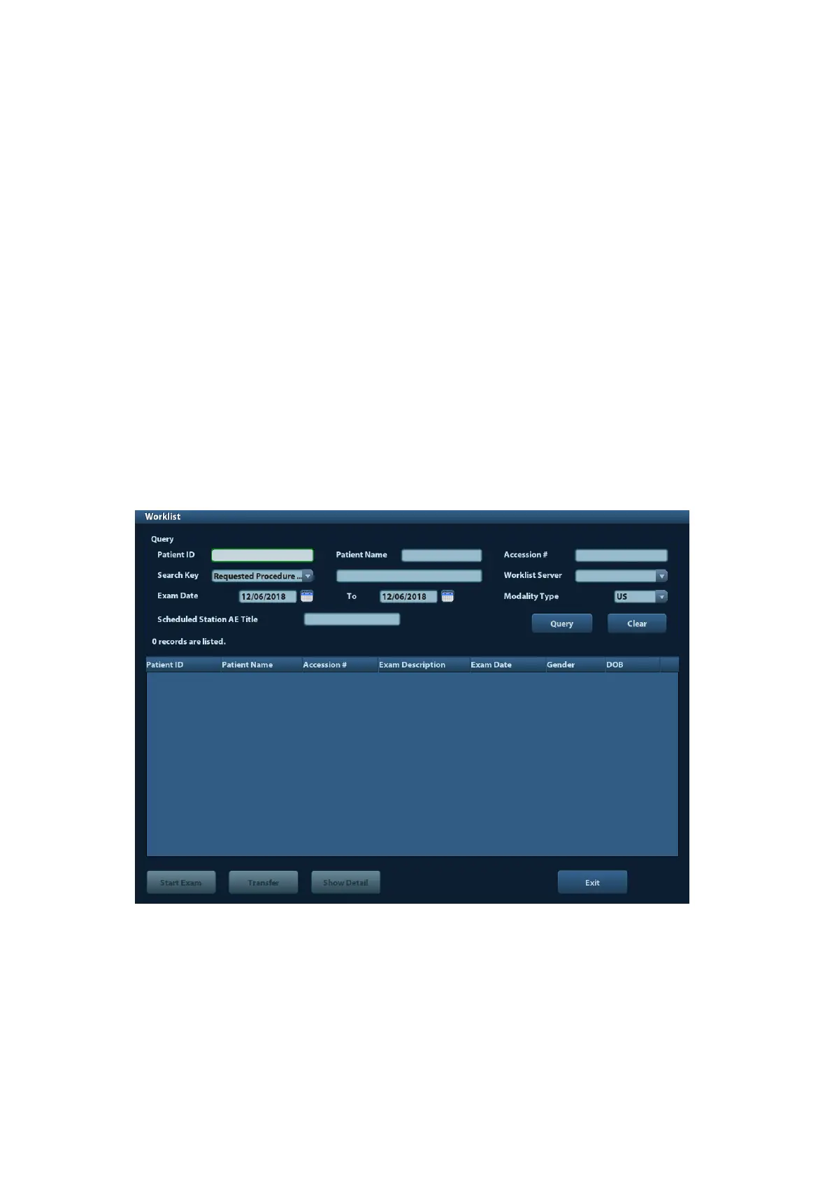 After successfully connected DICOM Worklist server with ultrasound system, you can query