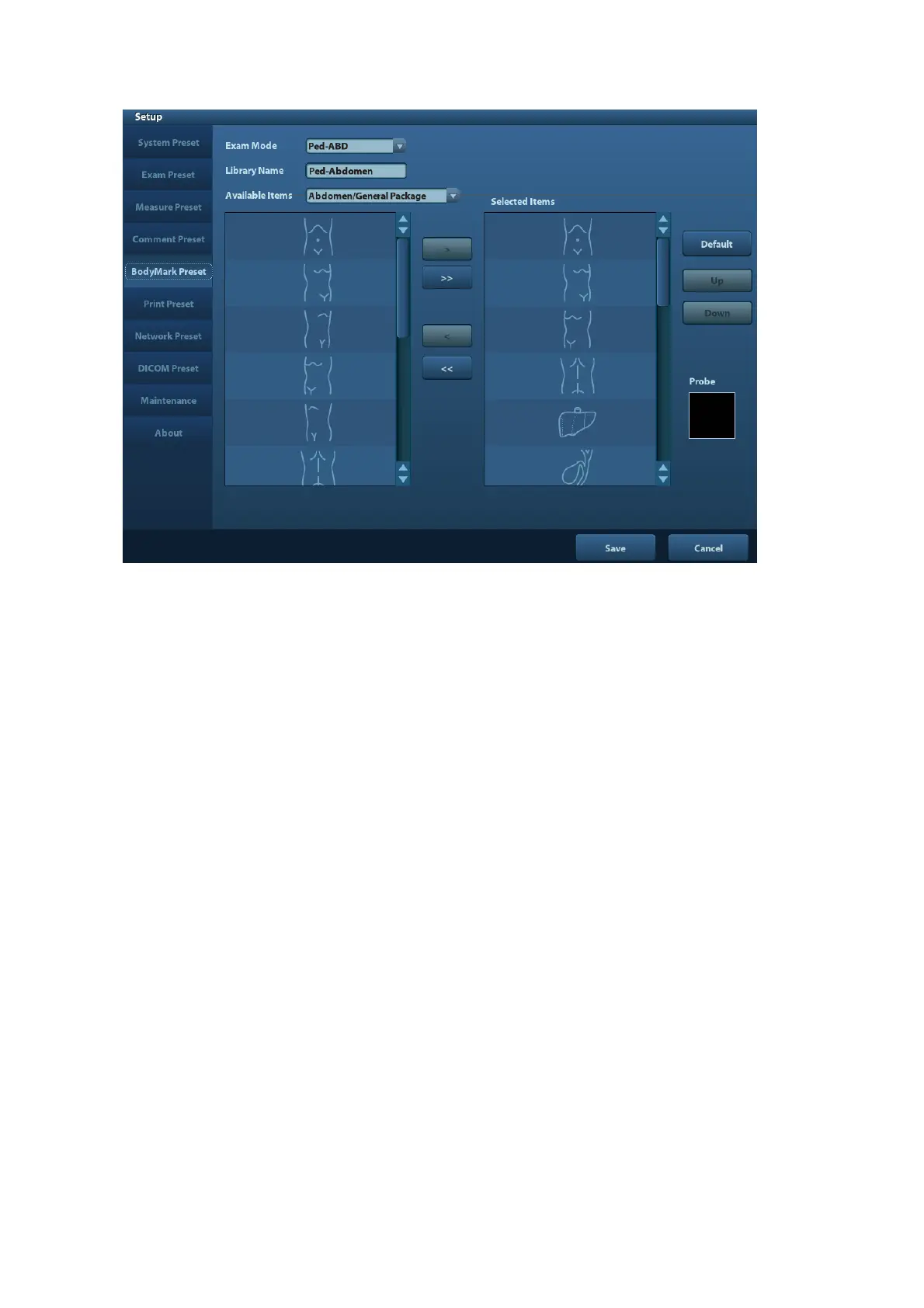7. Select the body mark in Selected Items and click [Default], and then the body mark will