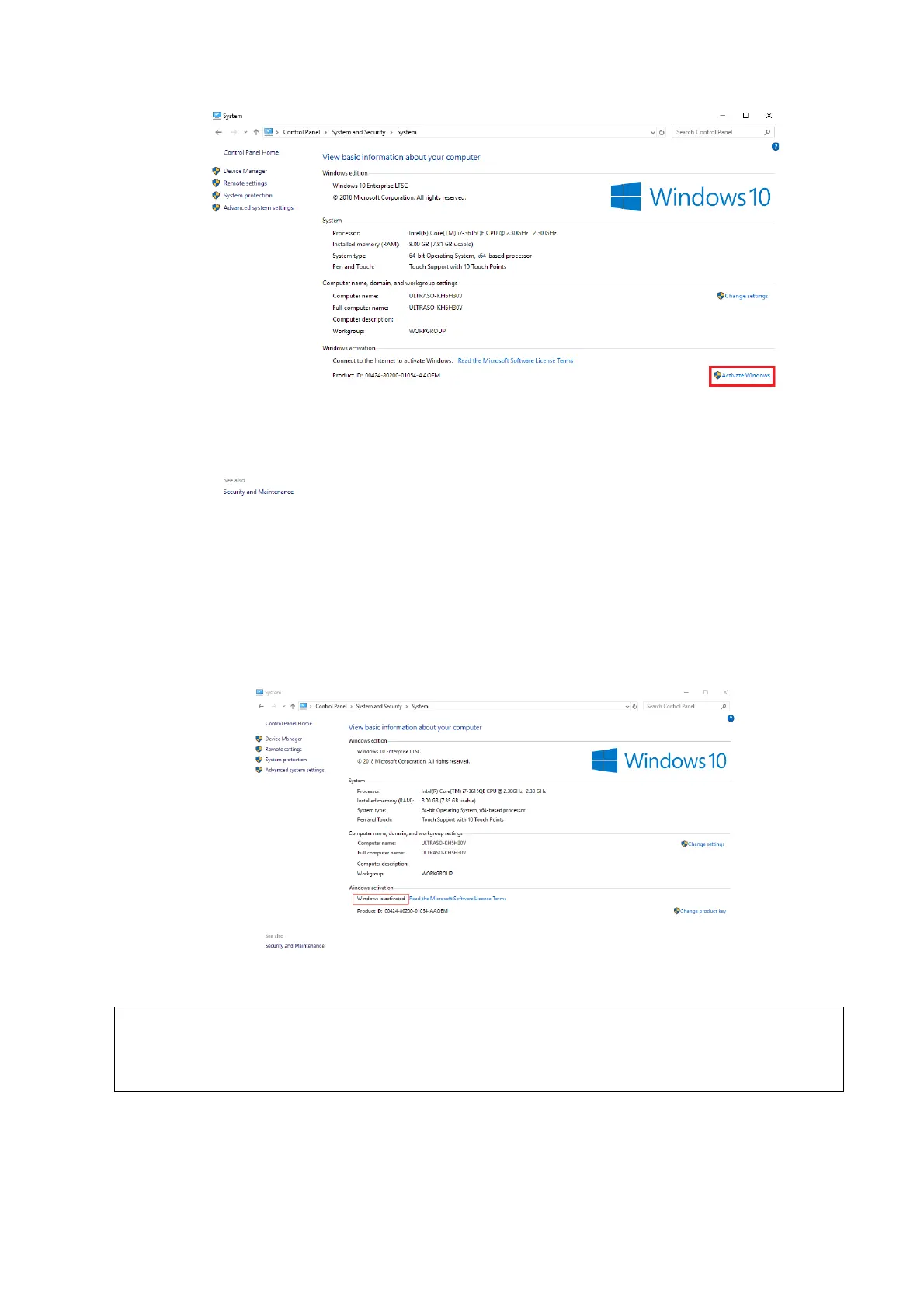 If the ultrasound system is offline, activate Windows 10 by using the phone activation method.