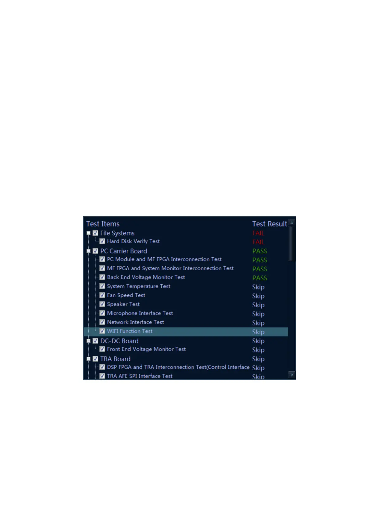 sub-item. Red FAIL indicates the failure of the sub-item. If the item has not been tested, it appears