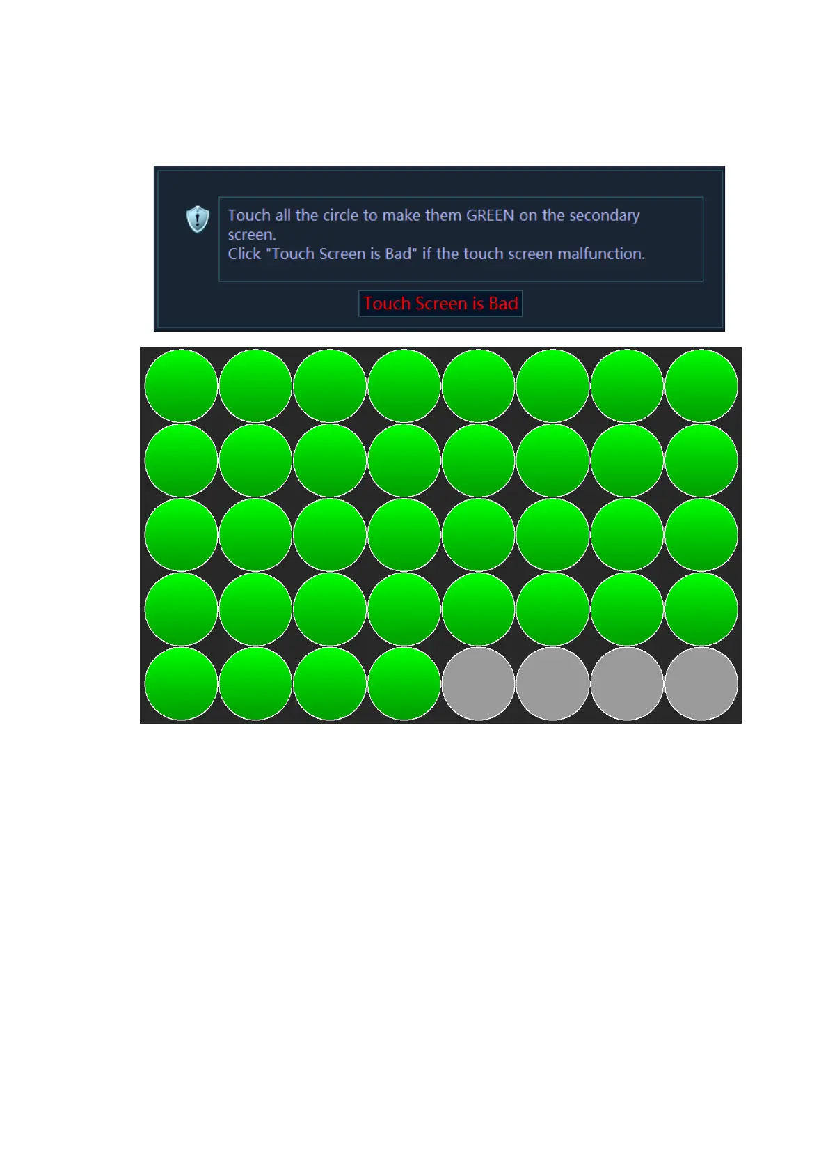 The program passes the test automatically if all circles turn into green. Click “Touch screen does