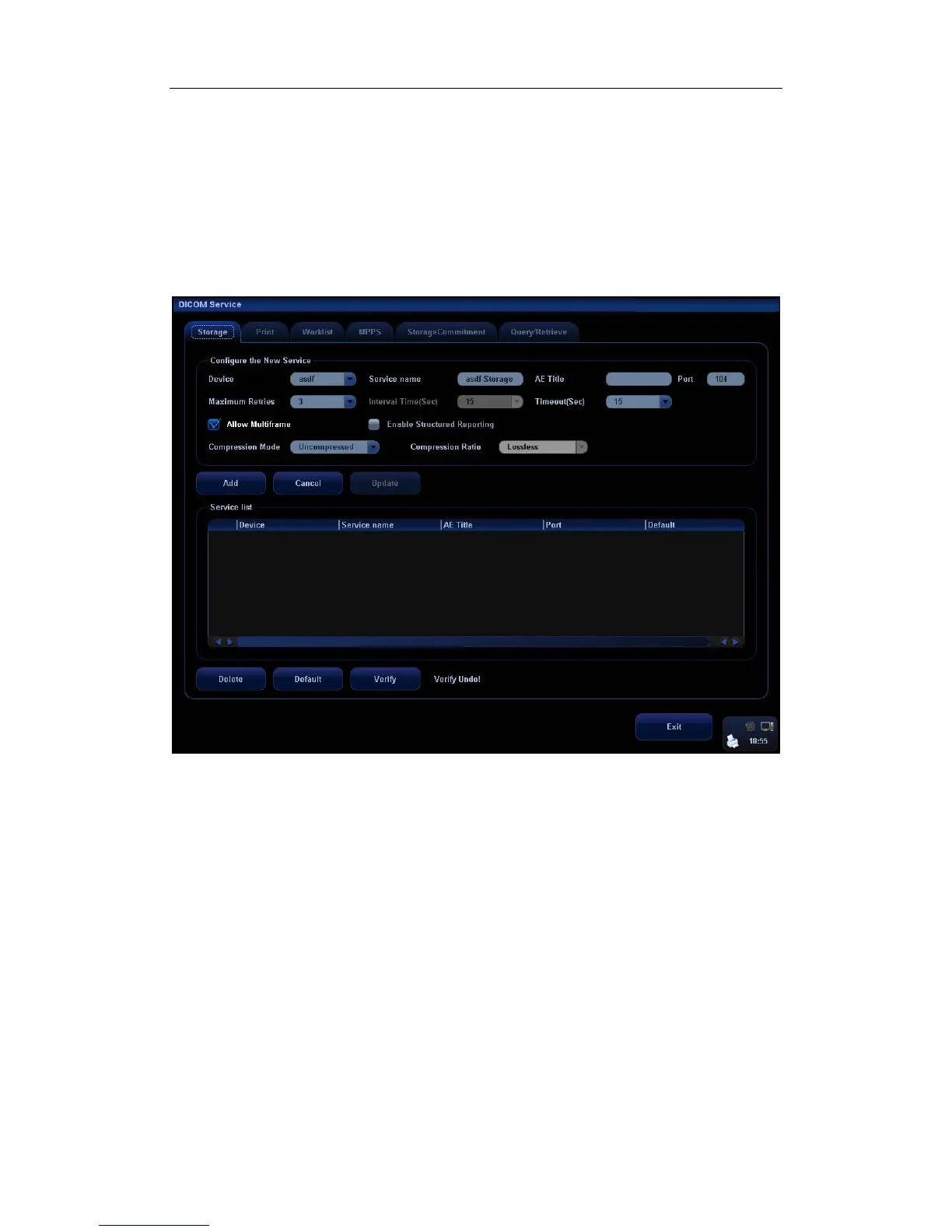 1. To enter the “Storage” page: “[Setup]→[Network Preset]→[DICOM Service