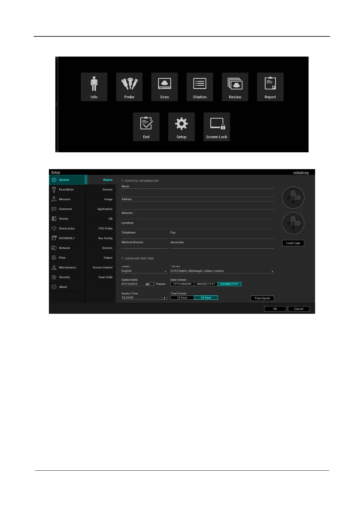 On the setup screen, choose System > Region, enter the hospital name in Name and click OK.