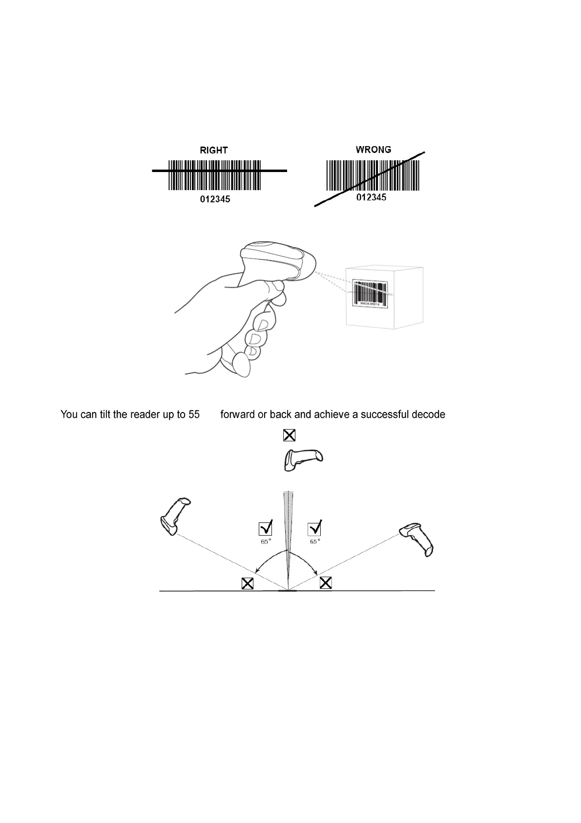 Tips: Do not hold the reader directly over the barcode. Laser light reflecting directly back into the reader