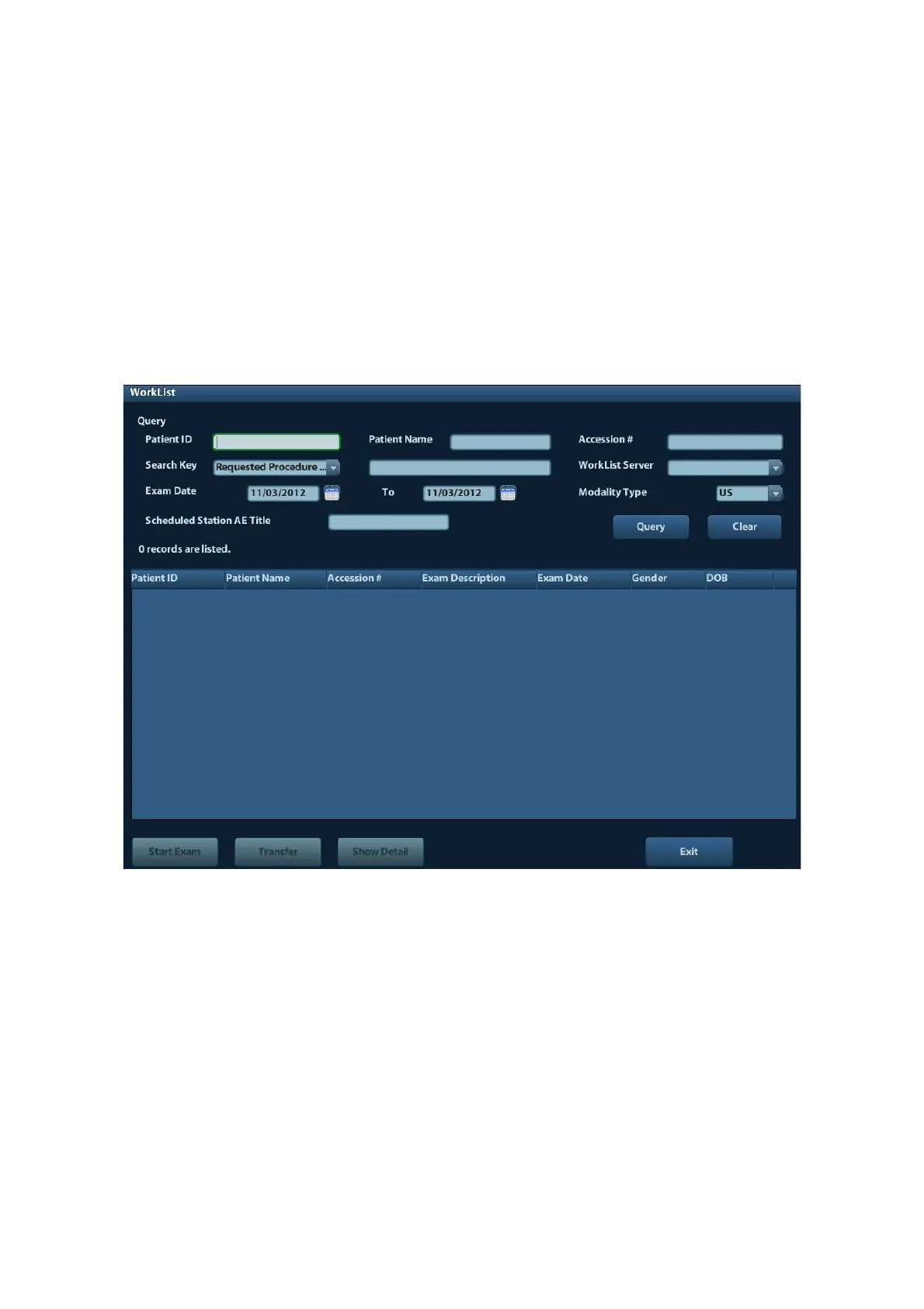 After successfully connected DICOM Worklist server with ultrasound system, you can query