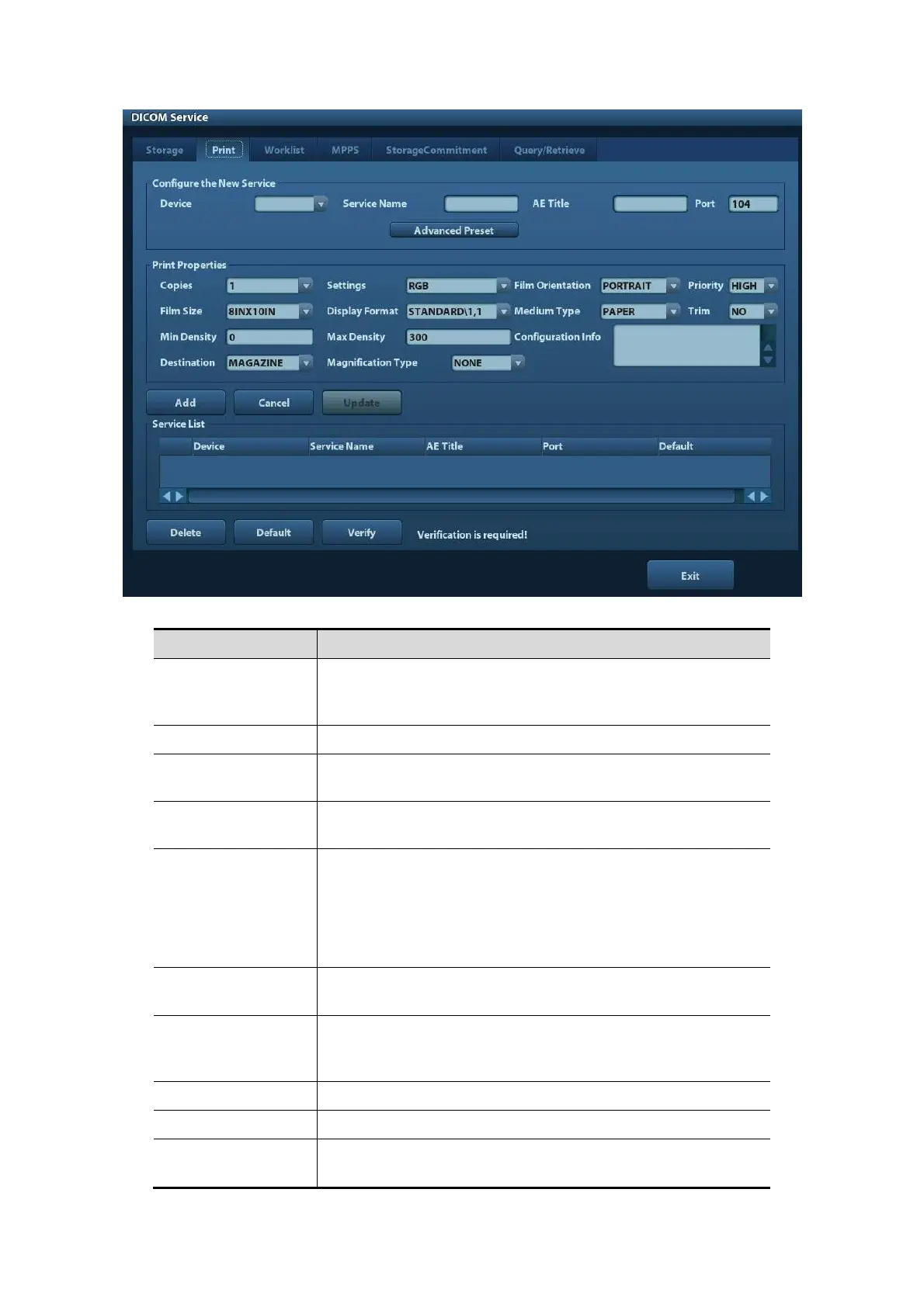 DICOM print setting items are described as follows: