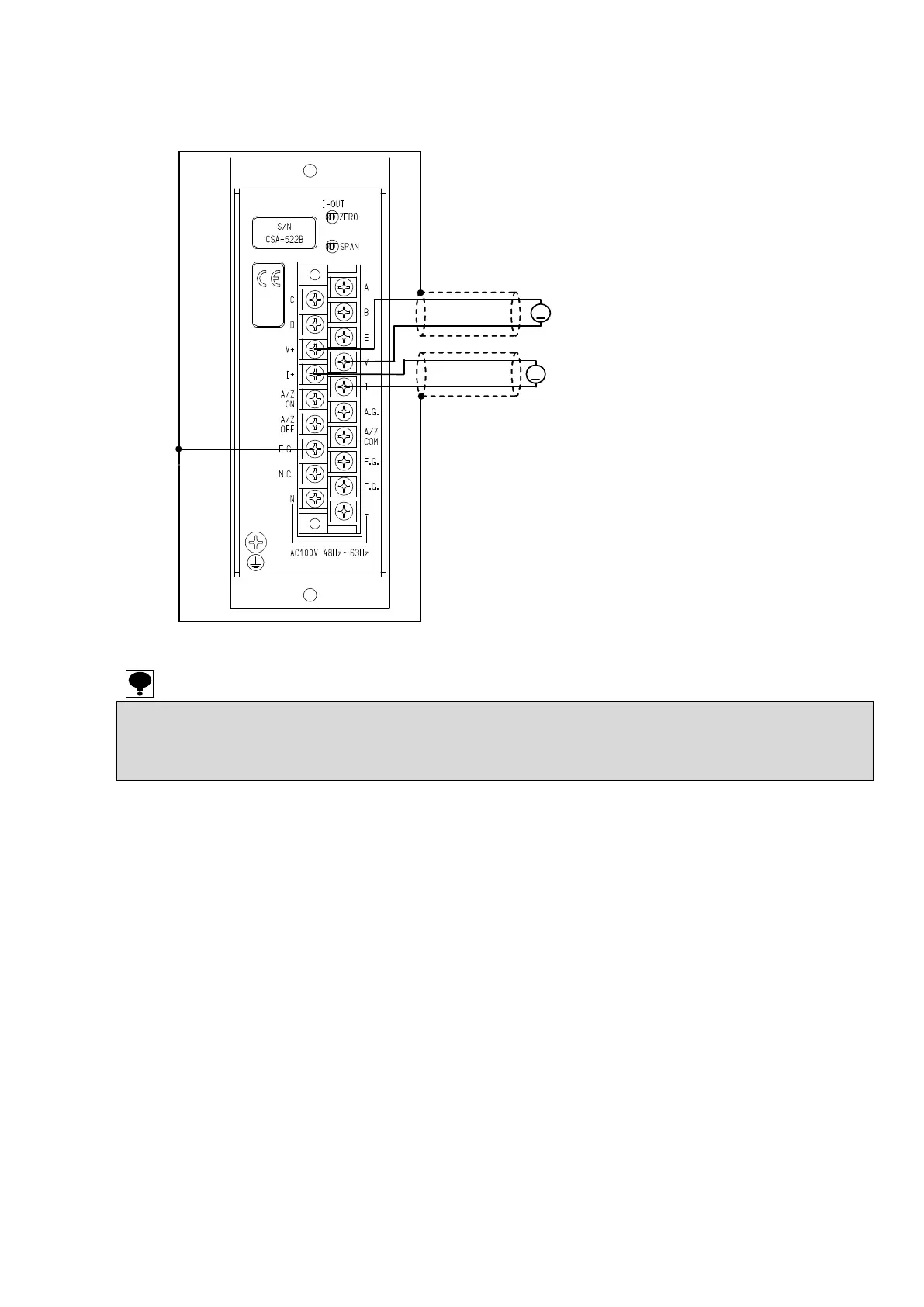 ● Please use the shielded cable for the connection with analog output, and connect the shield with F.G. terminal of the terminal block.