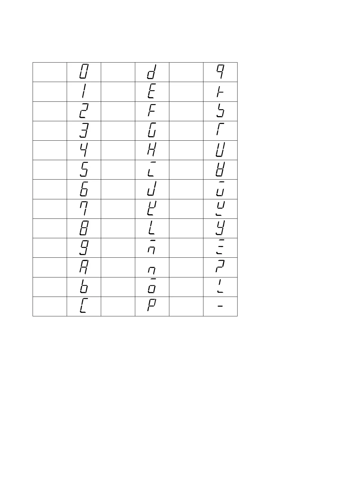 The display pattern in seven segments indicator of this instrument is shown in the table below.