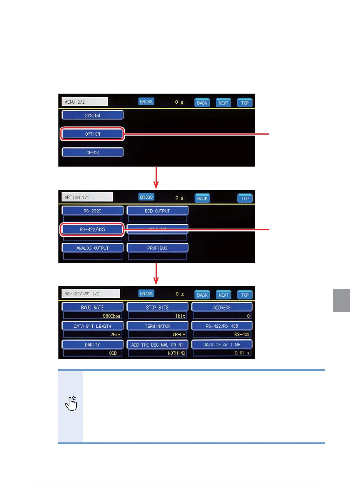 communication setting screen. To display the RS-422/485 communication setting screen, tap