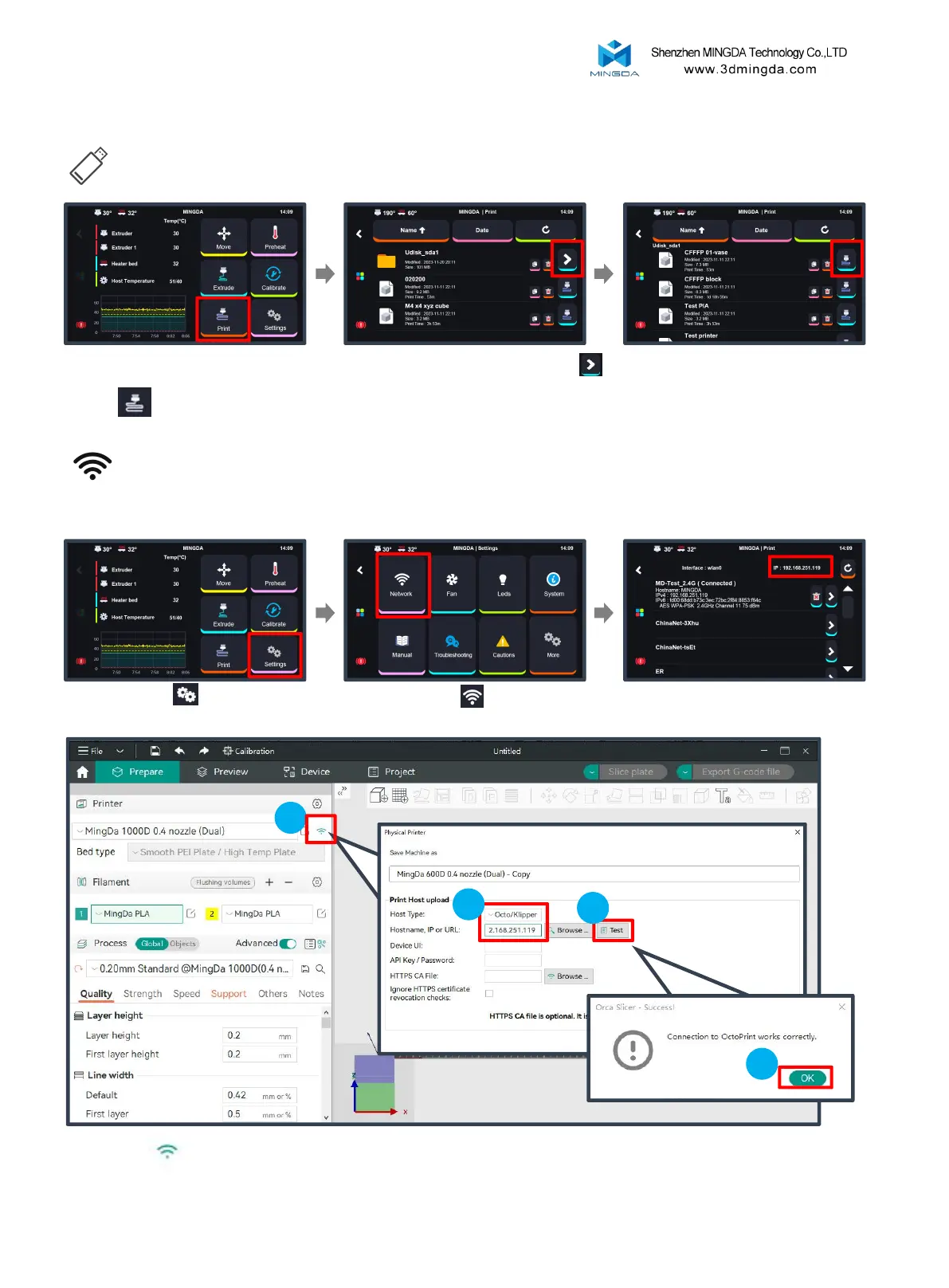 Click WIFI , select Host type as Octo/Klipper, enter the printer’s IP address, and click “Test” and “OK”