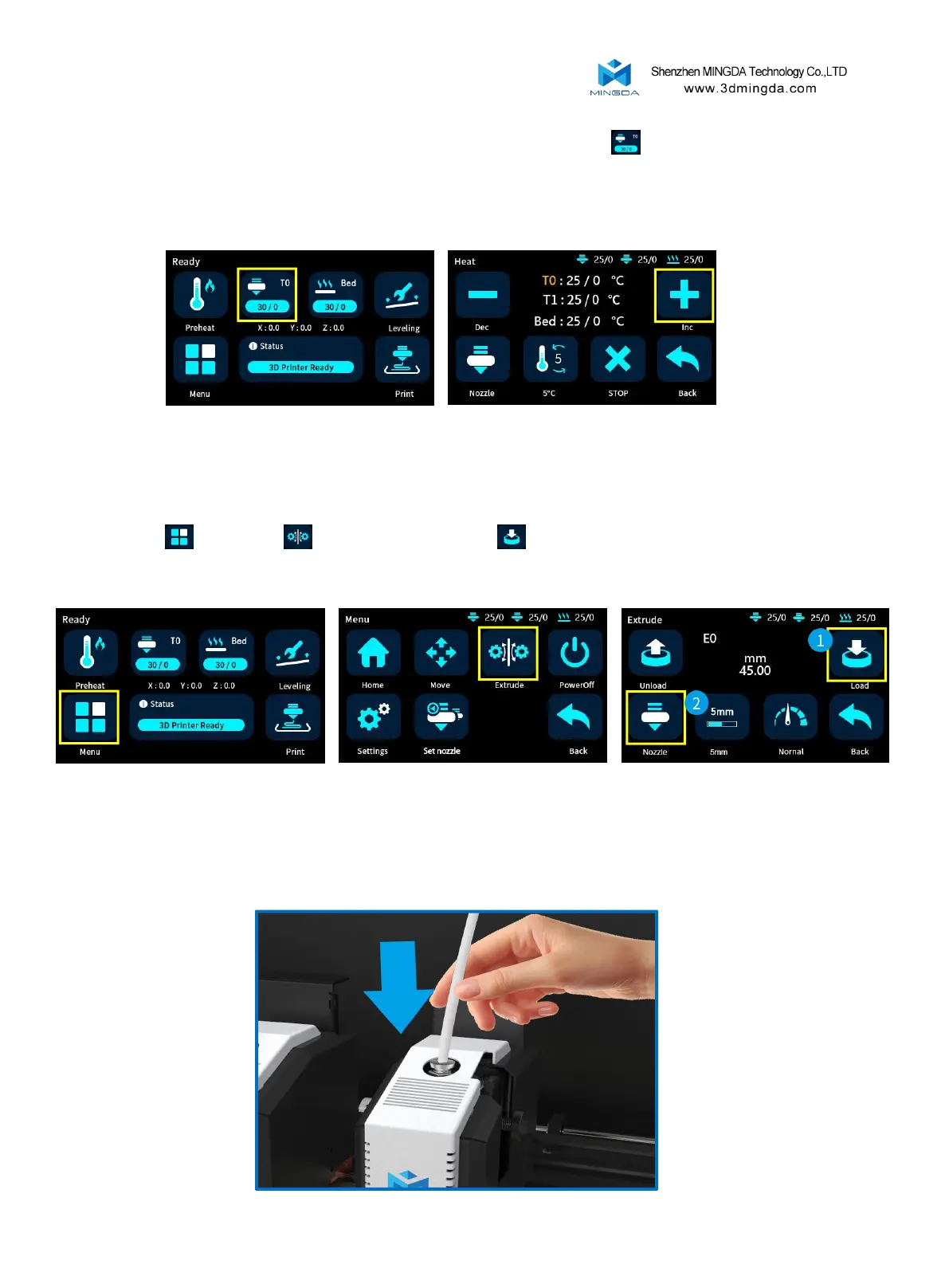"Menu" , "Extrude" , click the Load button to enter the feed, click the extruder
