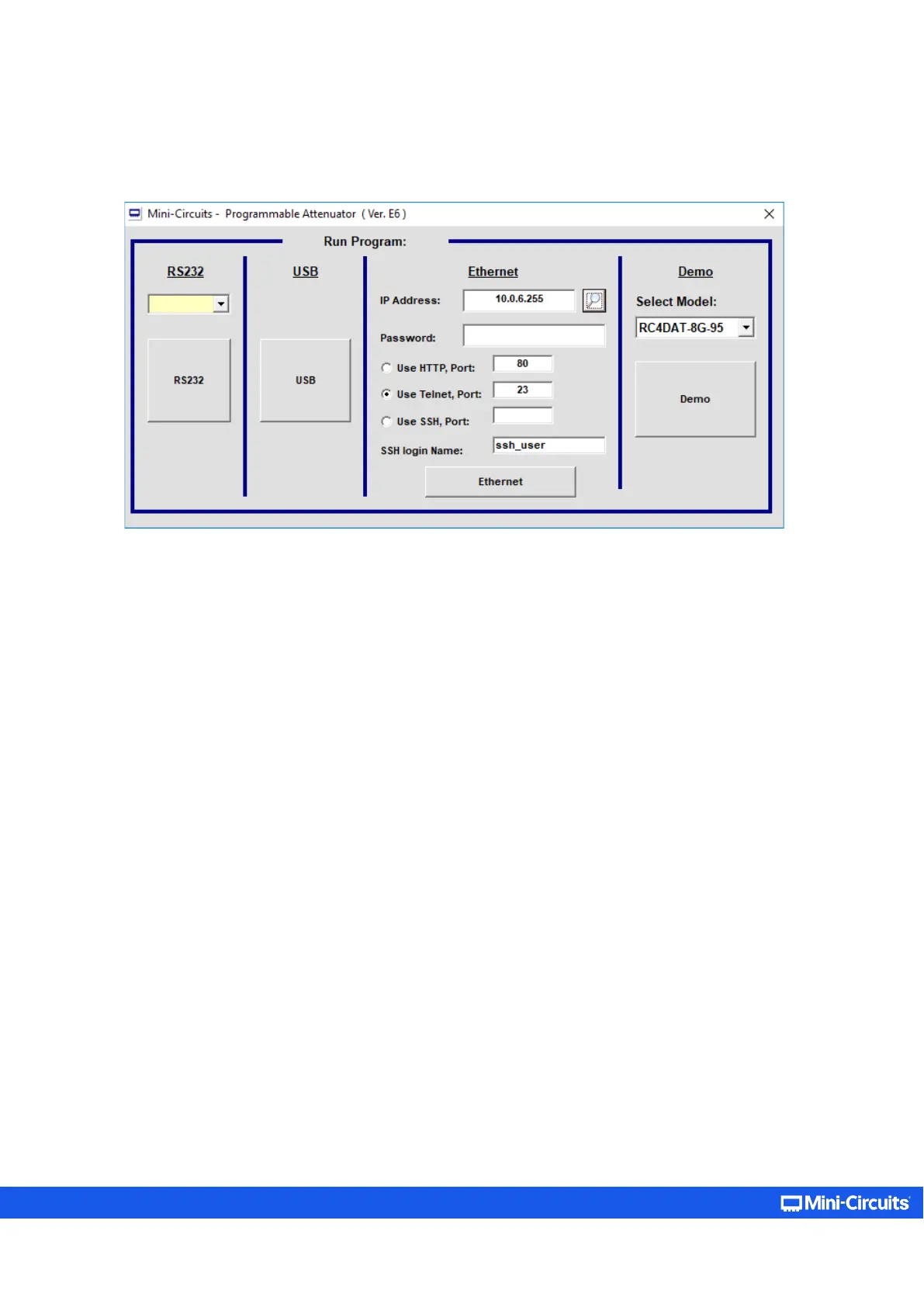 communication protocol you wish to use (HTTP, Telnet, or SSH) and click on the Ethernet button to begin.