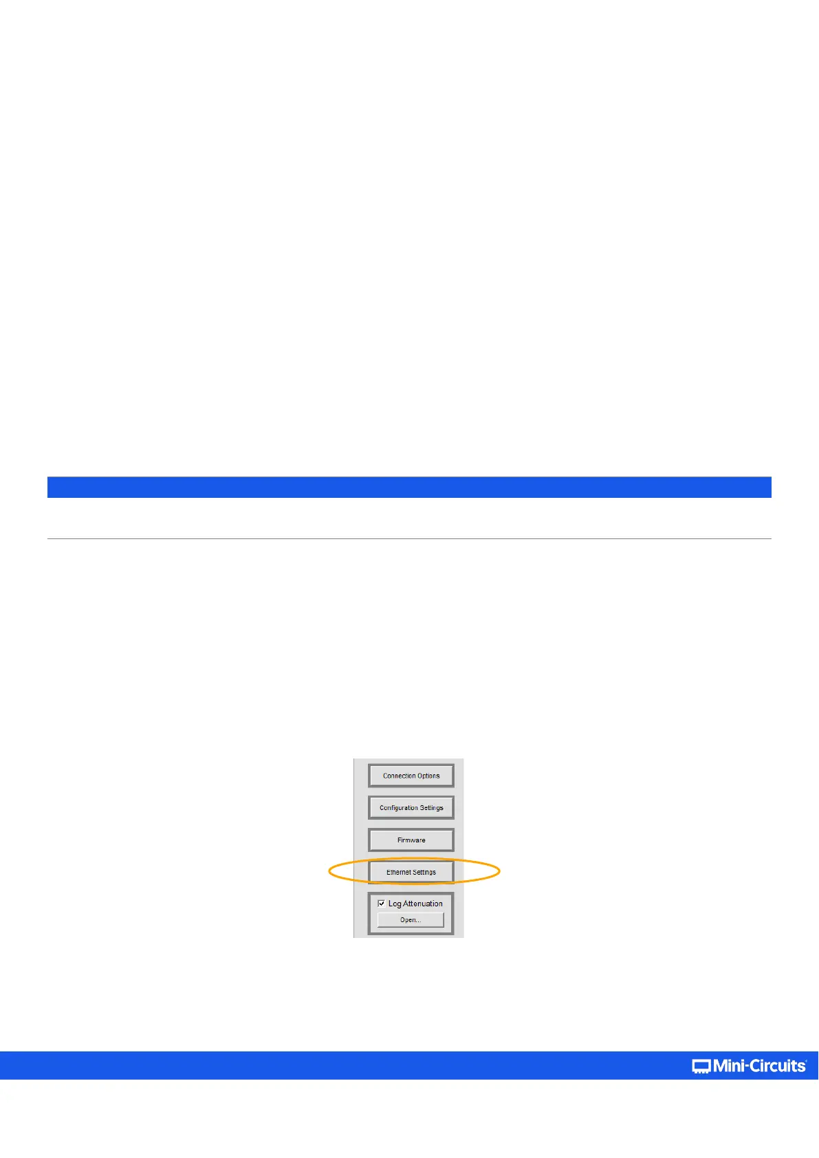 To change these settings, click on the Ethernet Settings button in the GUI, or use Mini-Circuits’ Ethernet configuration tool (see