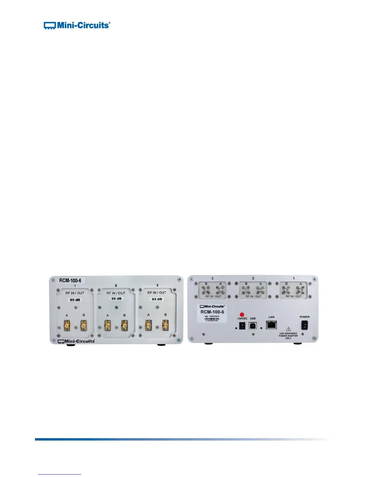 Figure 1: Front & rear panel of RCM-100-6 multi-channel programmable attenuator
