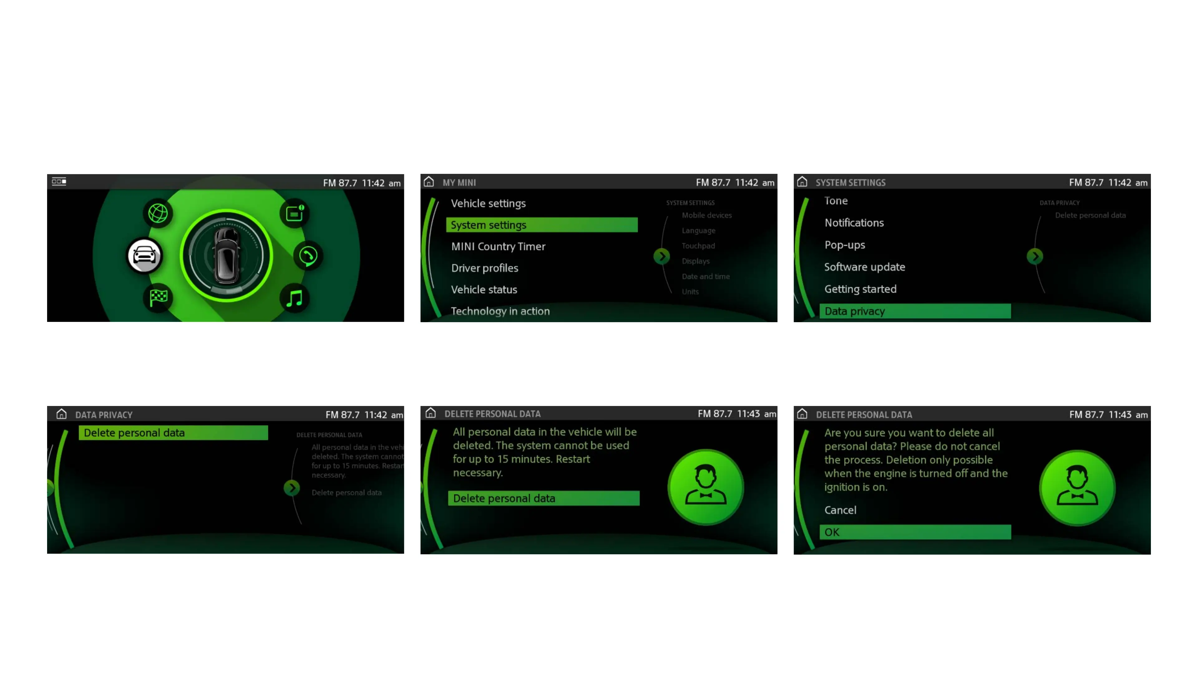 1. From the main menu, select MY MINI. 2. Select SYSTEM SETTINGS. 3. Select DATA PRIVACY.