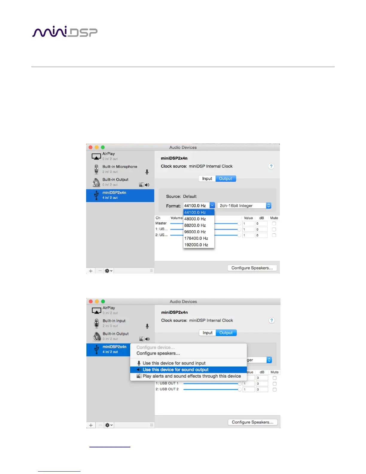 Open the program Audio MIDI Setup (in Applications->Utilities). The 2x4 HD will appear as “miniDSP2x4n” in