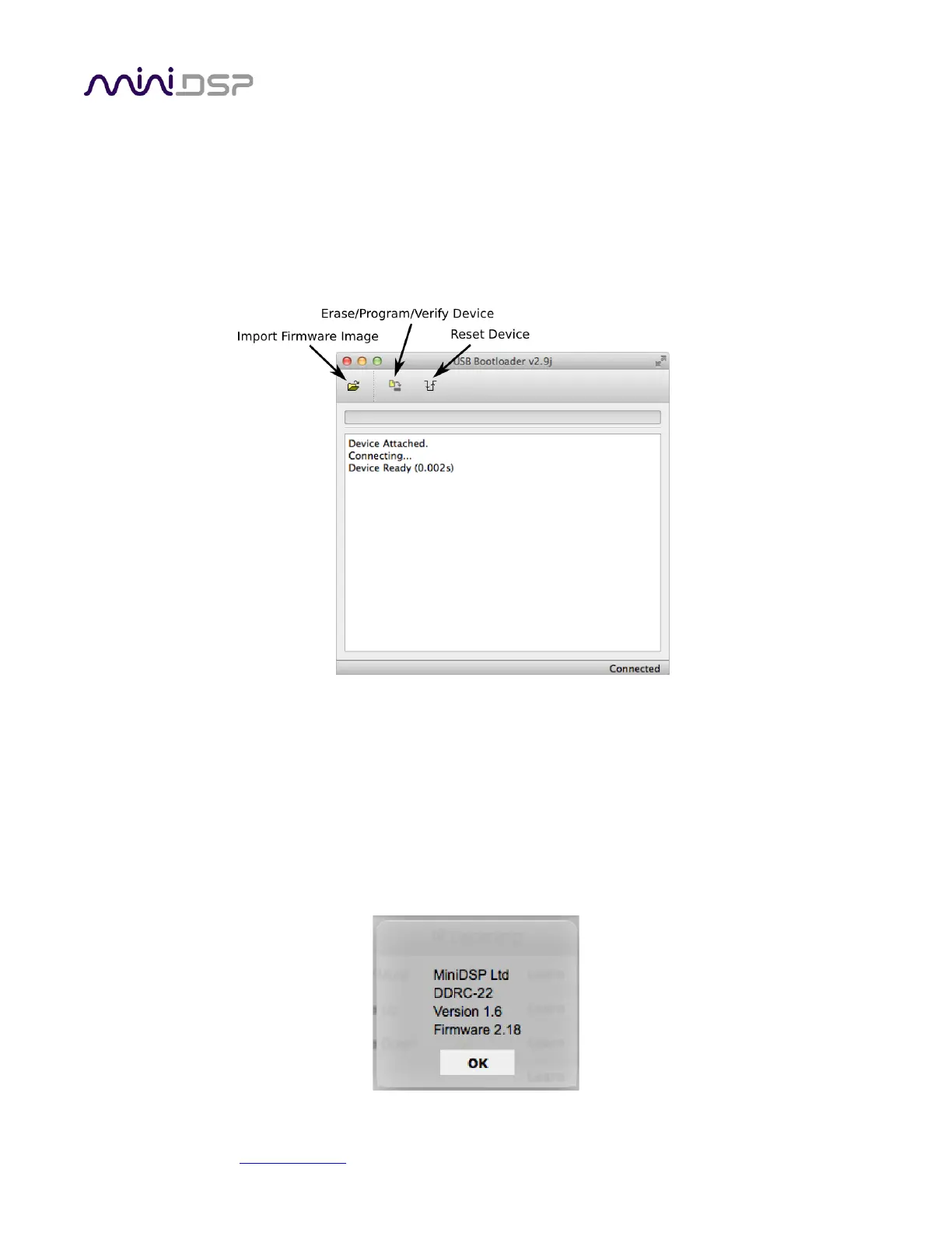 4. Click on the Upgrade Firmware button. The DDRC-22D will be put into boot loader mode and the miniDSP