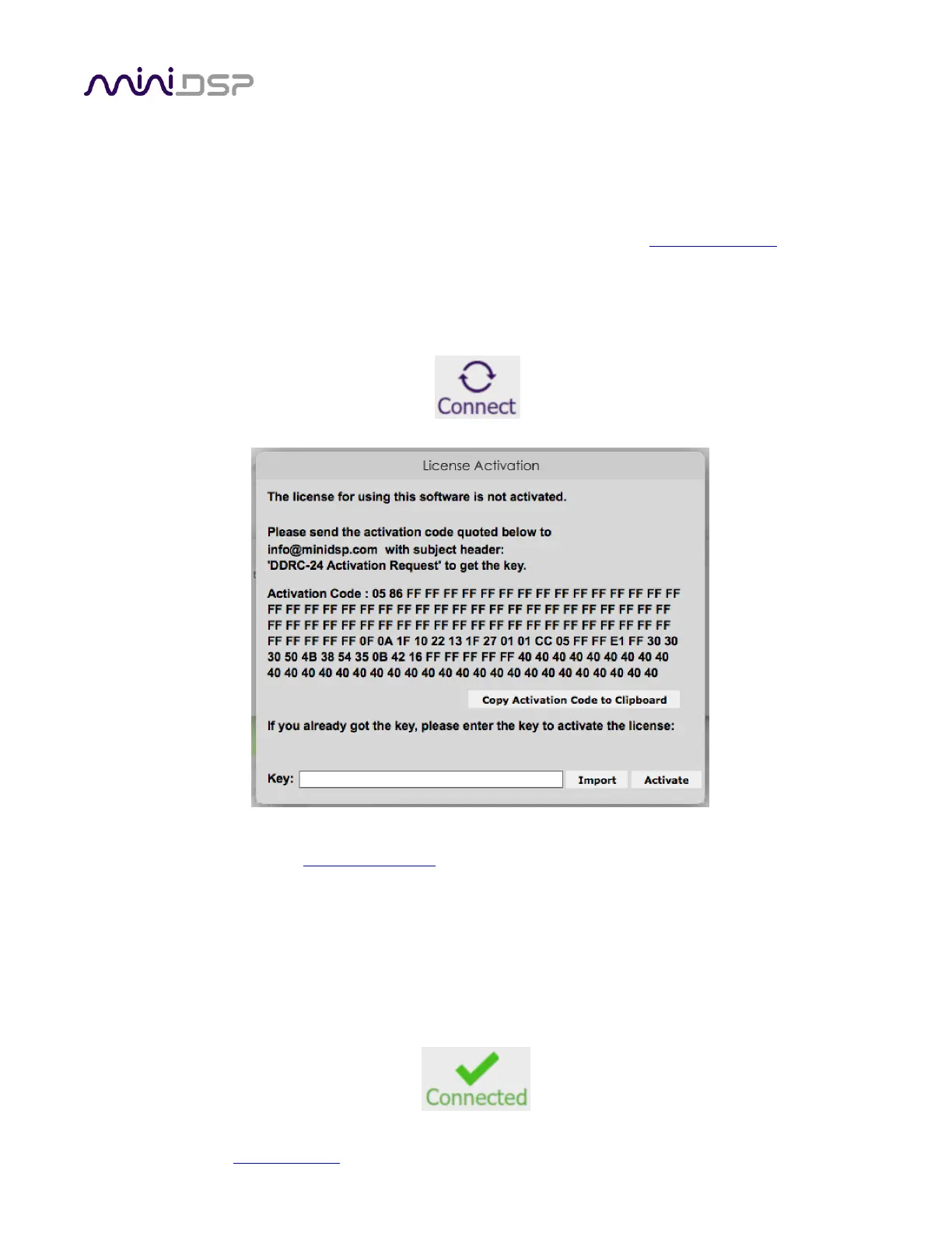 7. miniDSP will respond in normal (Hong Kong) working hours with an activation key file (.txt file). (Please