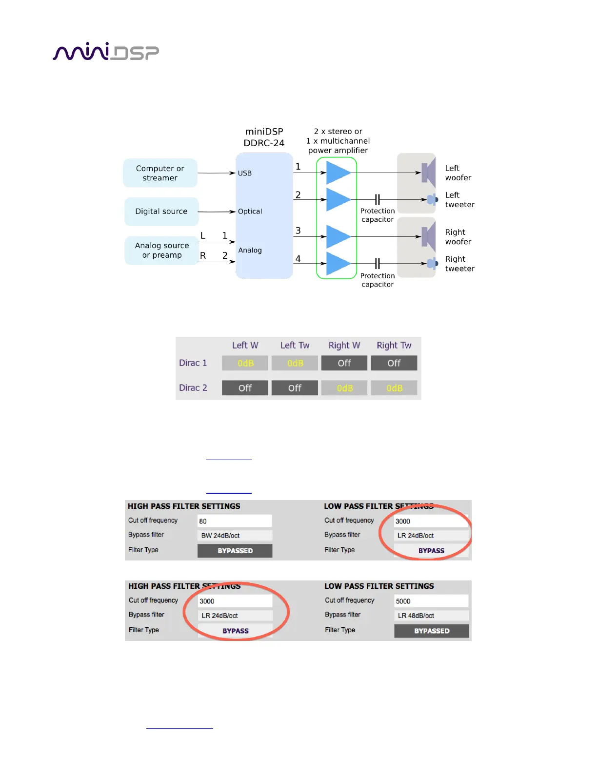 The miniDSP DDRC-24 can implement a two-way active speaker as well as provide room correction. This diagram