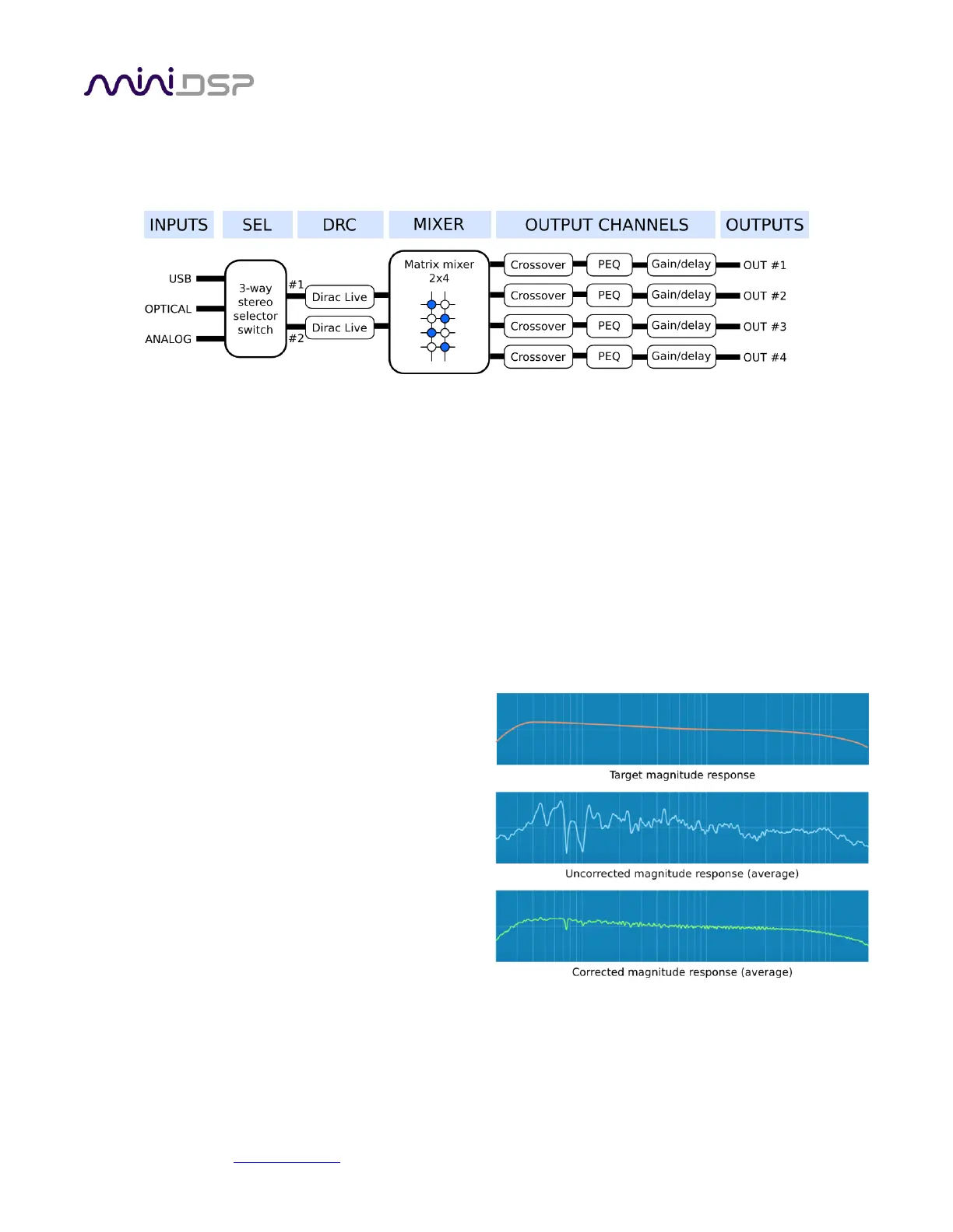The processing in the ground-breaking miniDSP DDRC-24 is best described in terms of a signal flow diagram: