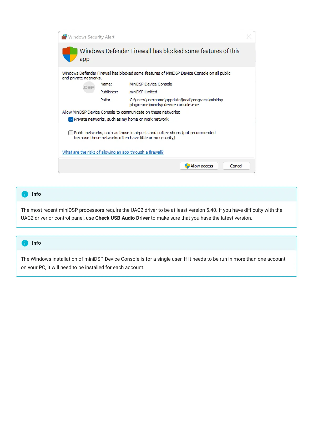 The most recent miniDSP processors require the UAC2 driver to be at least version 5.40. If you have diculty with the