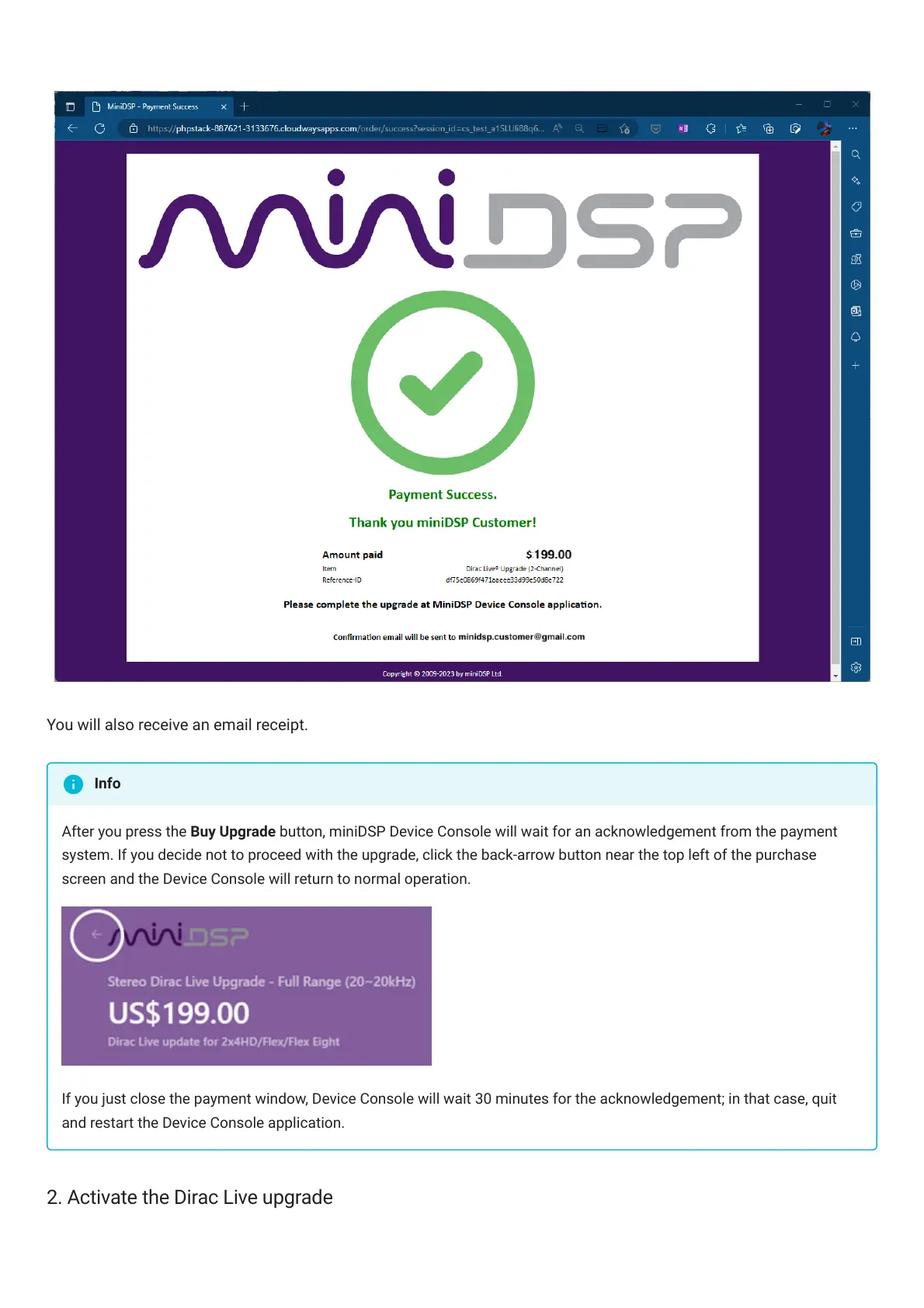 After you press the Buy Upgrade button, miniDSPDeviceConsole will wait for an acknowledgement from the payment