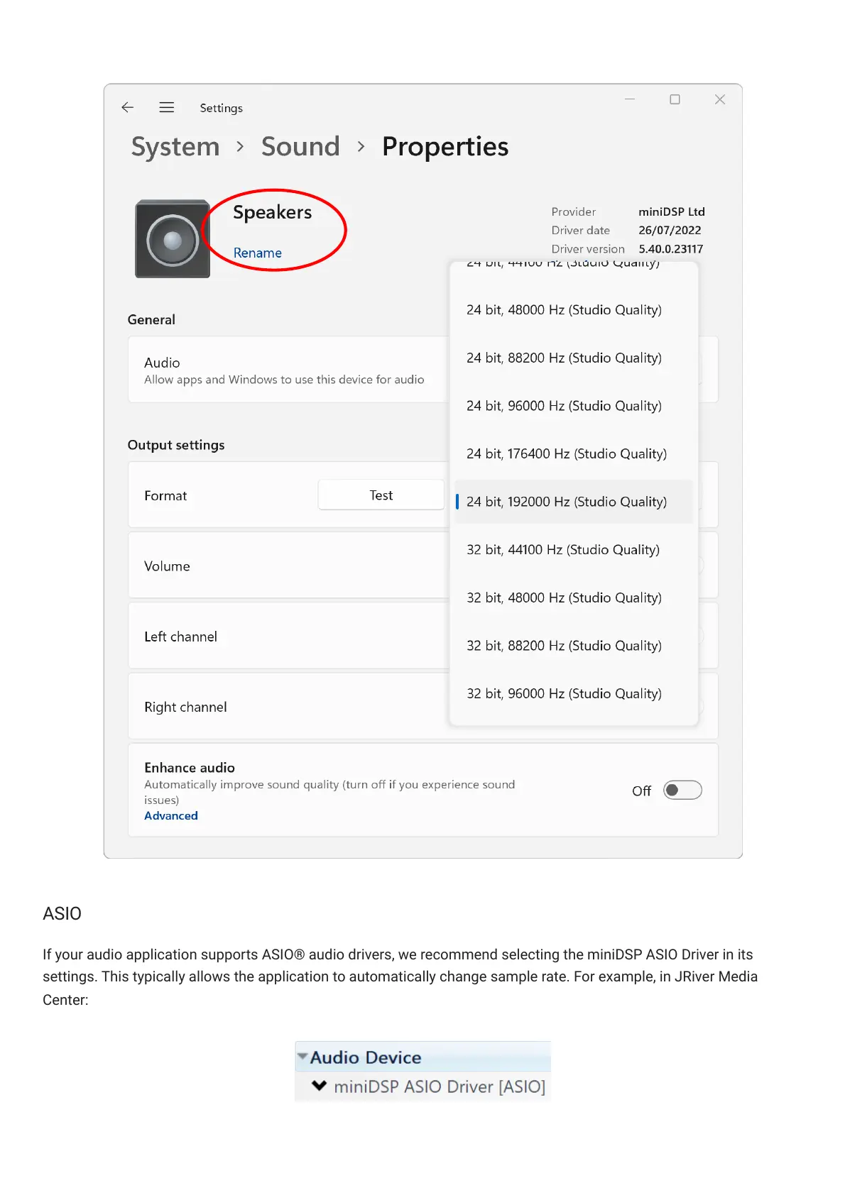If your audio application supports ASIO® audio drivers, we recommend selecting the miniDSP ASIO Driver in its