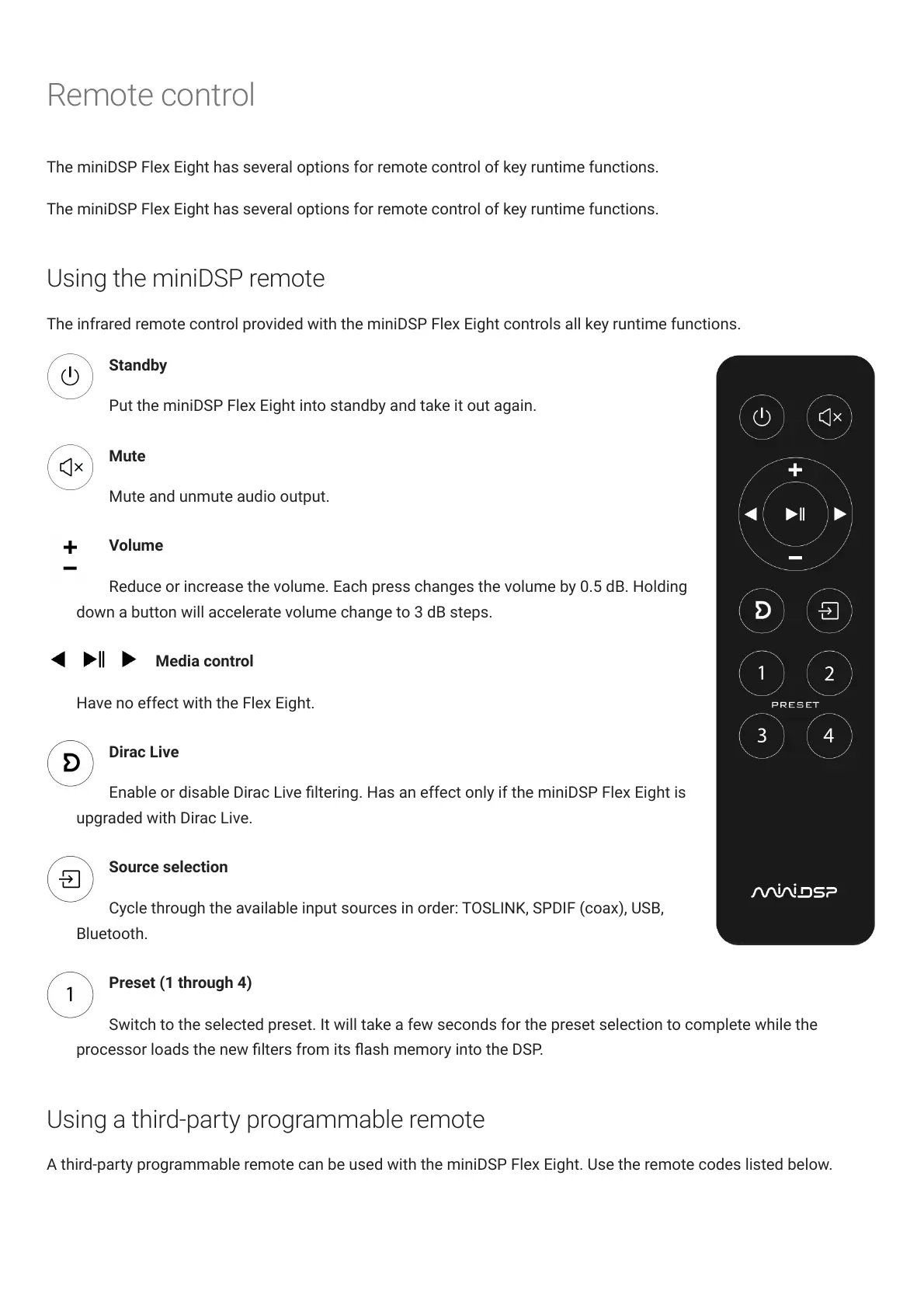 A third-party programmable remote can be used with the miniDSPFlexEight. Use the remote codes listed below.
