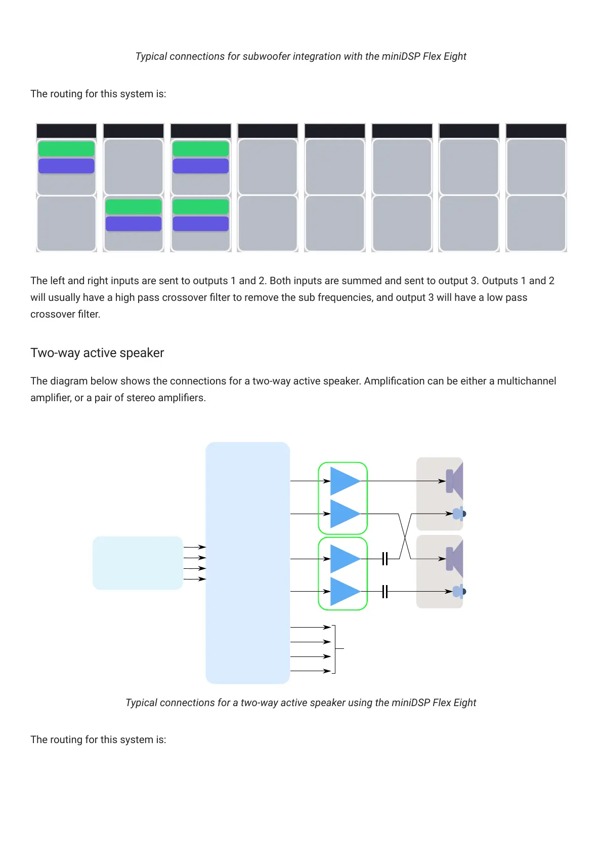 Typical connections for a two-way active speaker using the miniDSPFlexEight