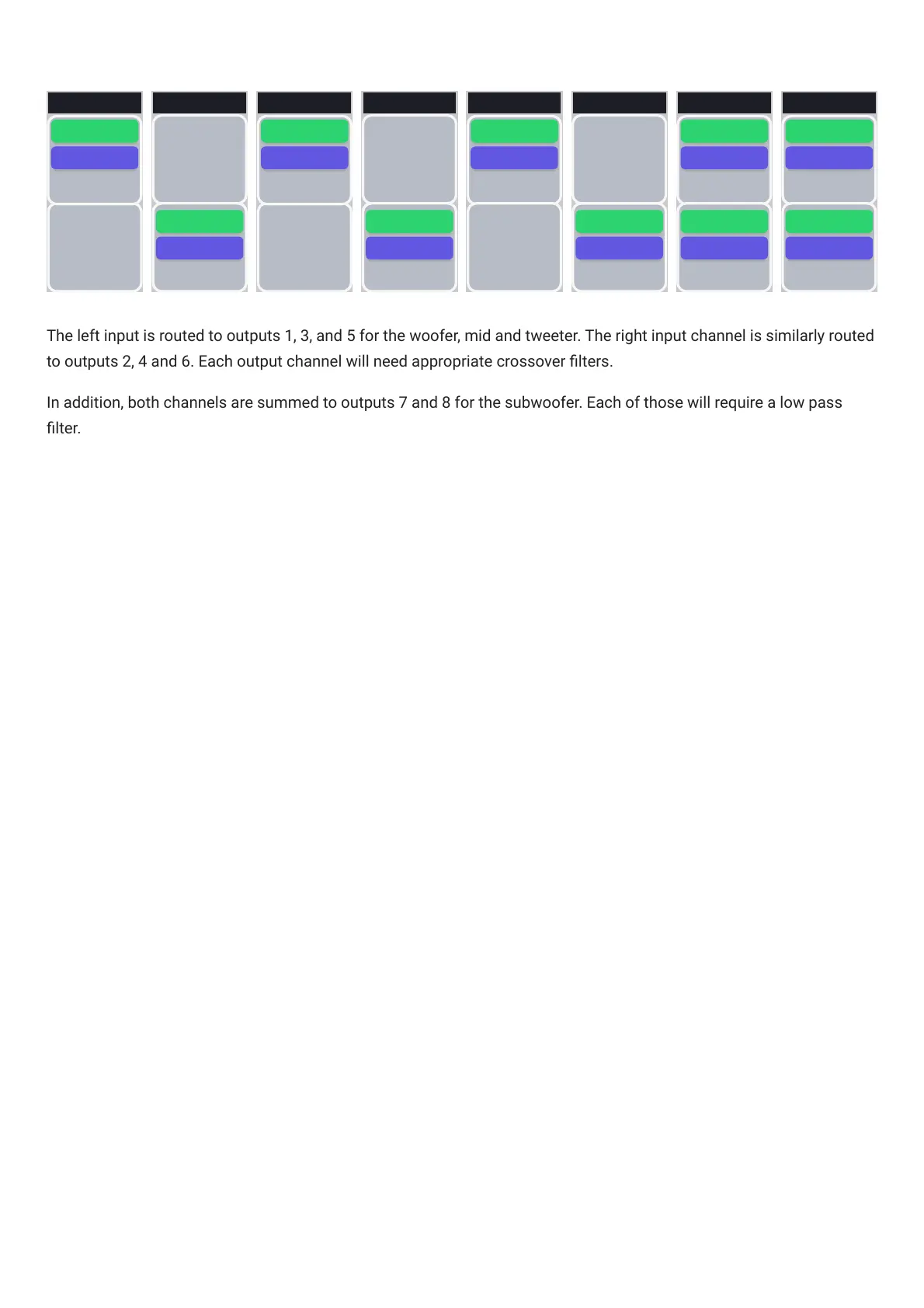 The left input is routed to outputs 1, 3, and 5 for the woofer, mid and tweeter. The right input channel is similarly routed