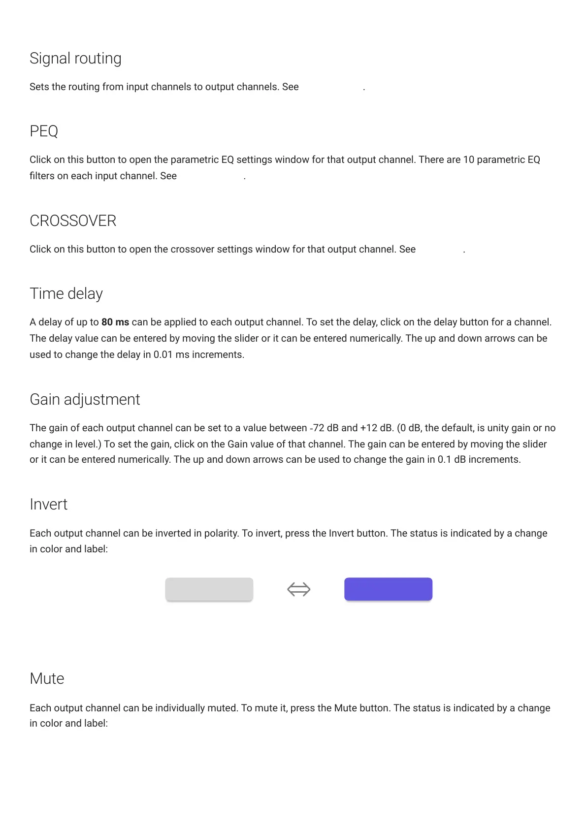 The gain of each output channel can be set to a value between ‑72dB and +12dB. (0 dB, the default, is unity gain or no