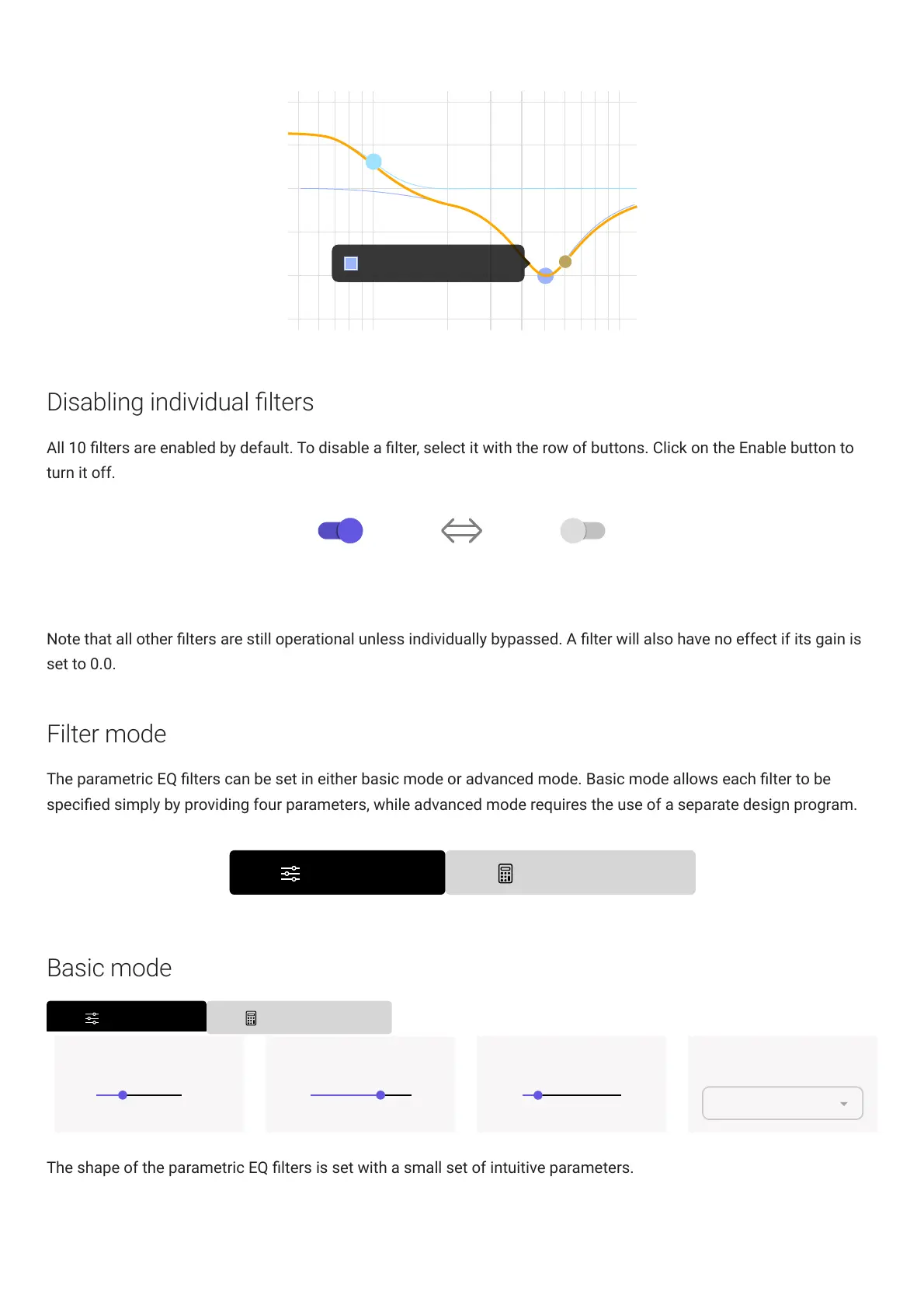 The parametric EQ lters can be set in either basic mode or advanced mode. Basic mode allows each lter to be
