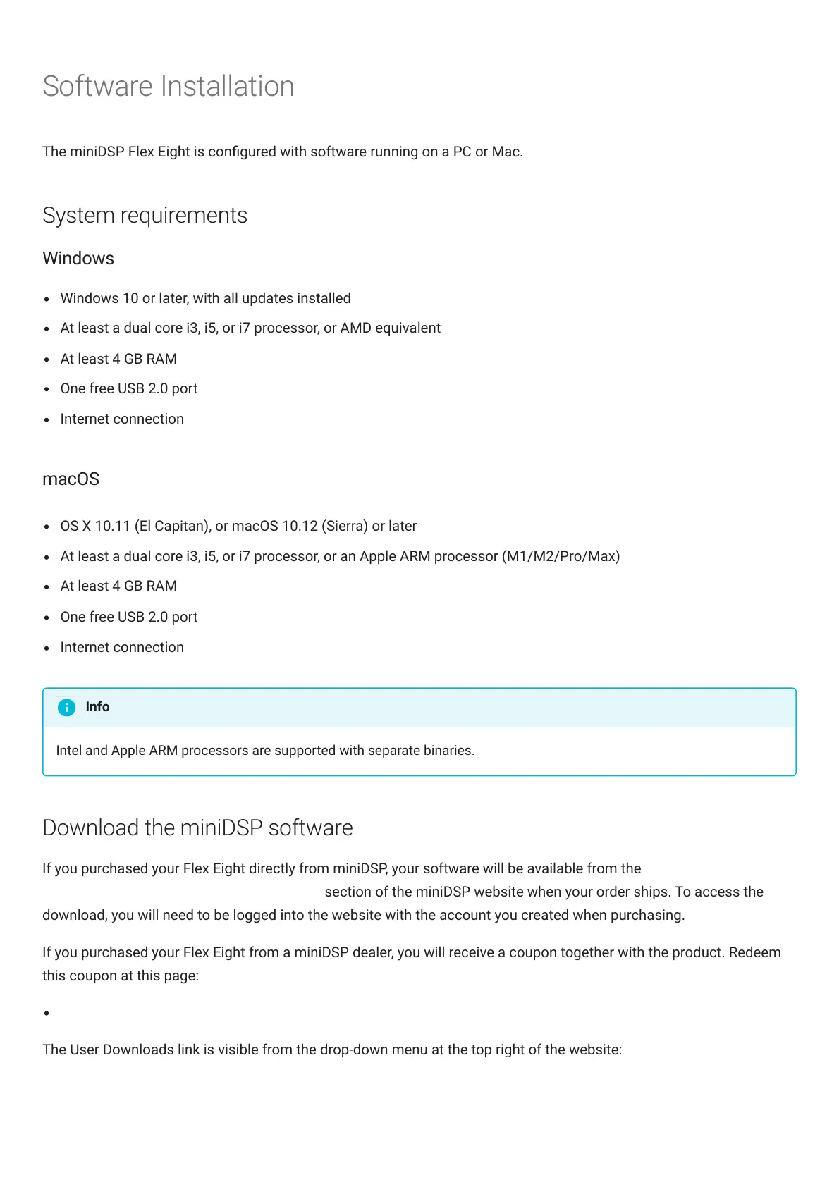 If you purchased your FlexEight directly from miniDSP, your software will be available from the User Downloads