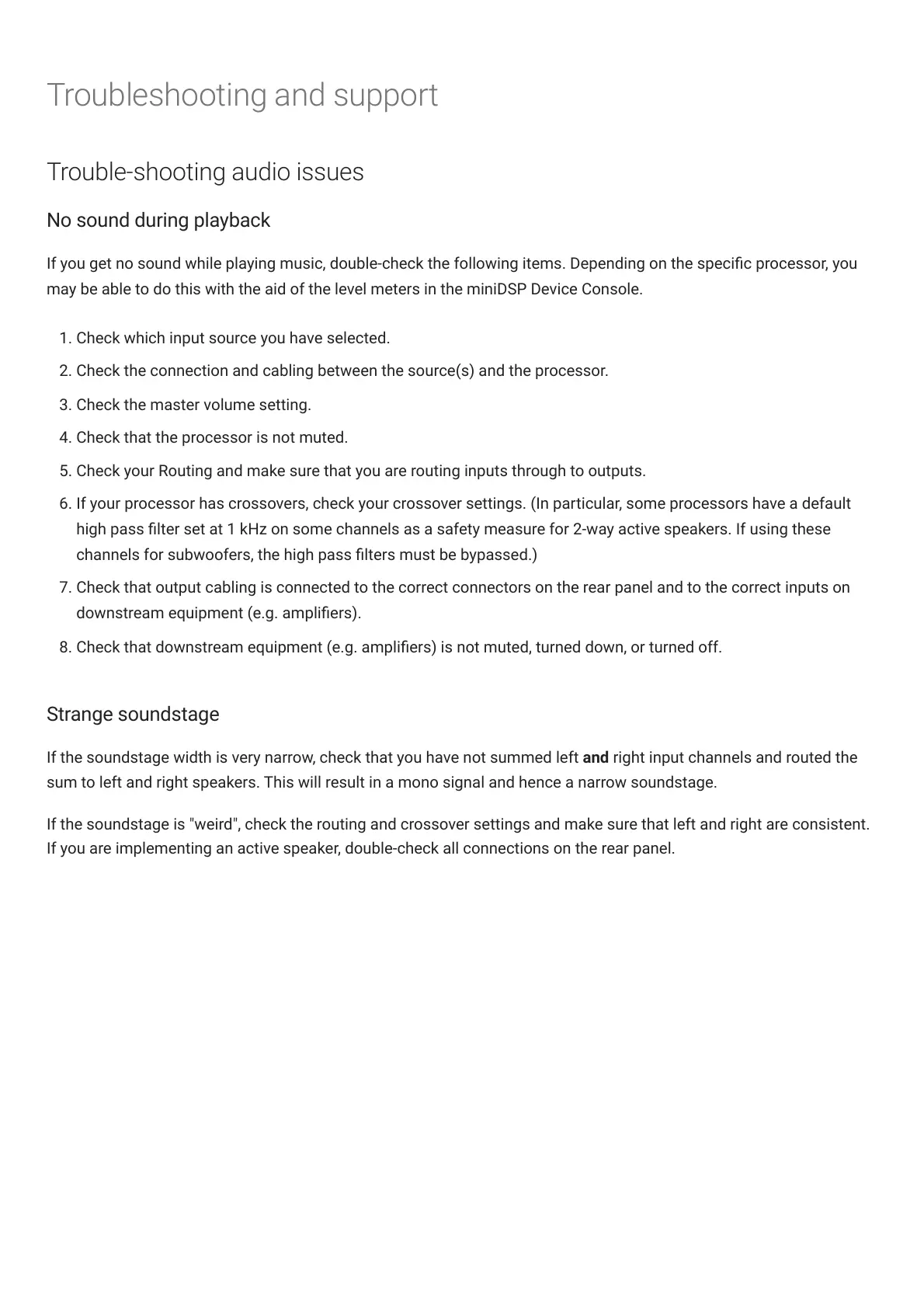 . Check that downstream equipment (e.g. ampliers) is not muted, turned down, or turned off.