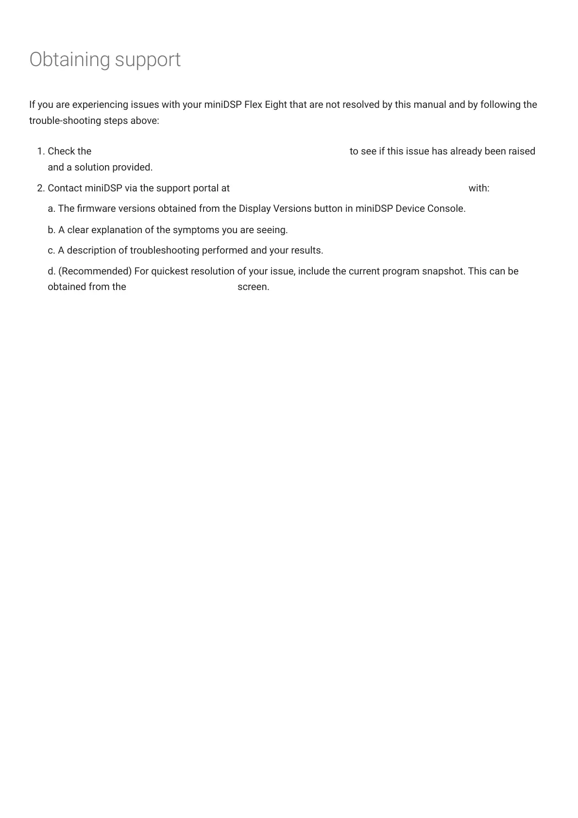If you are experiencing issues with your miniDSPFlexEight that are not resolved by this manual and by following the