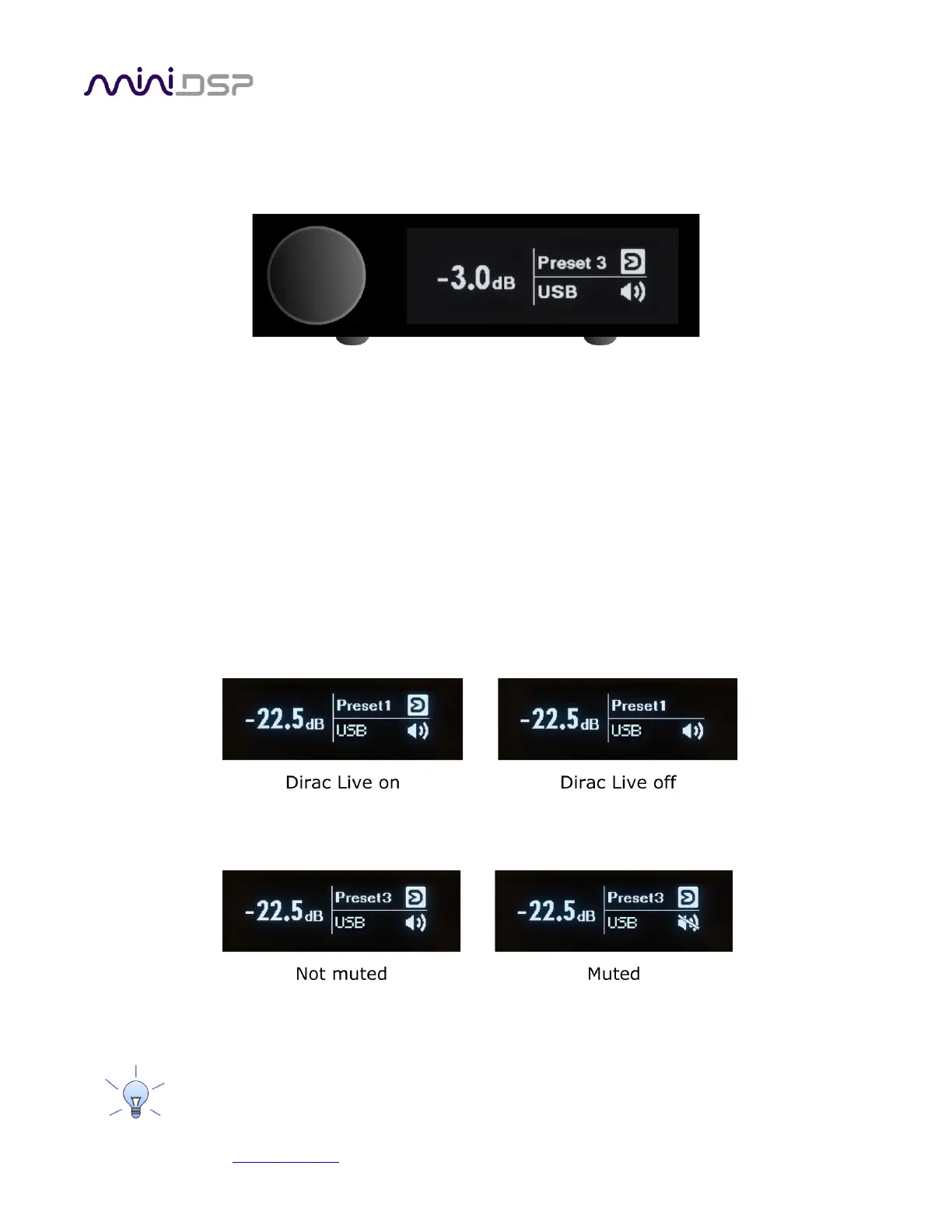• To change the volume, rotate the encoder knob. Volume changes in 0.5 dB steps. Minimum volume is -127.5