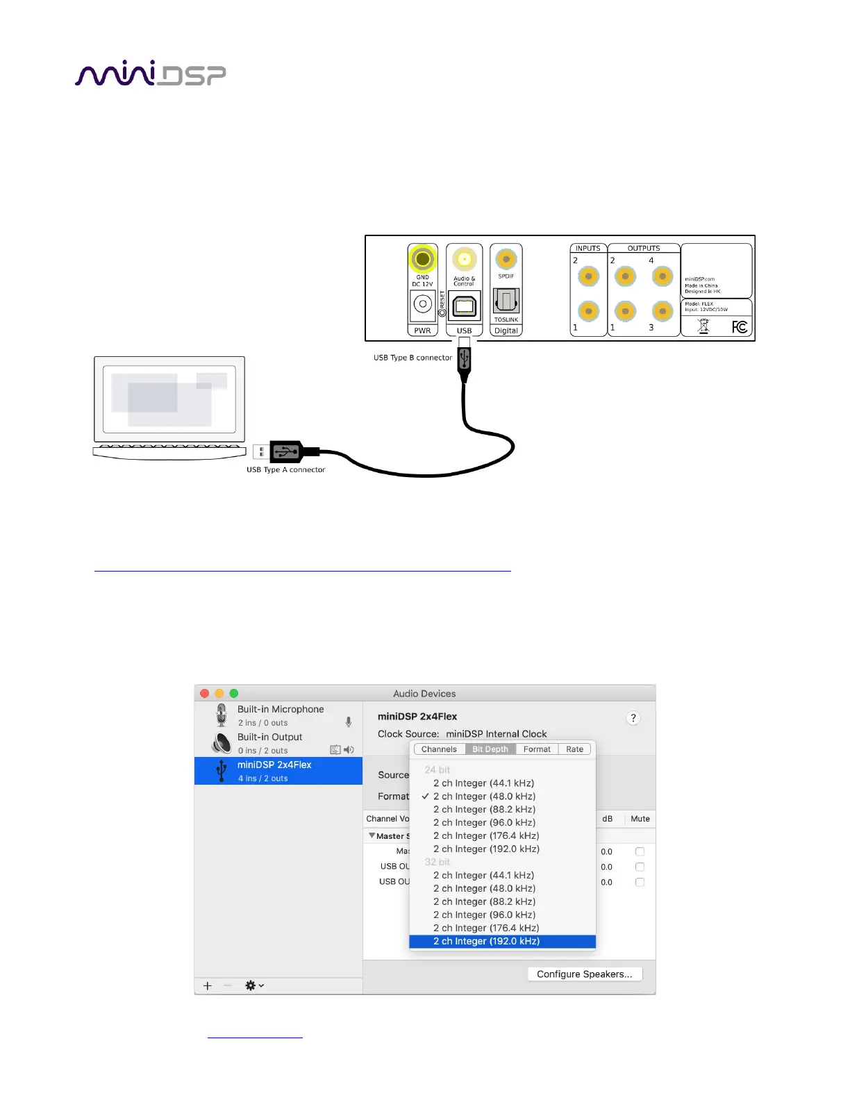 Open Audio MIDI Setup (in Applications->Utilities) and click on “miniDSP 2x4Flex” in the list on the left-hand
