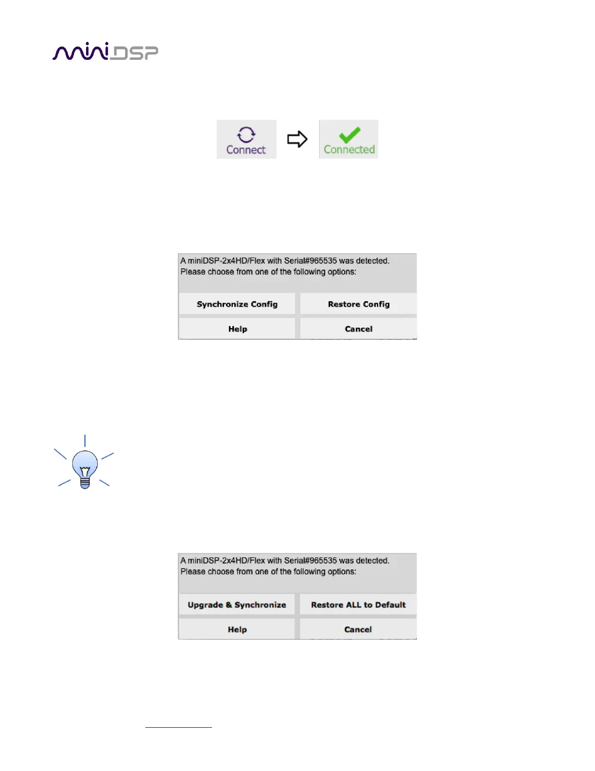 Connect the miniDSP Flex to a USB 2.0 port on your computer. In the plugin, click on the Connect button: