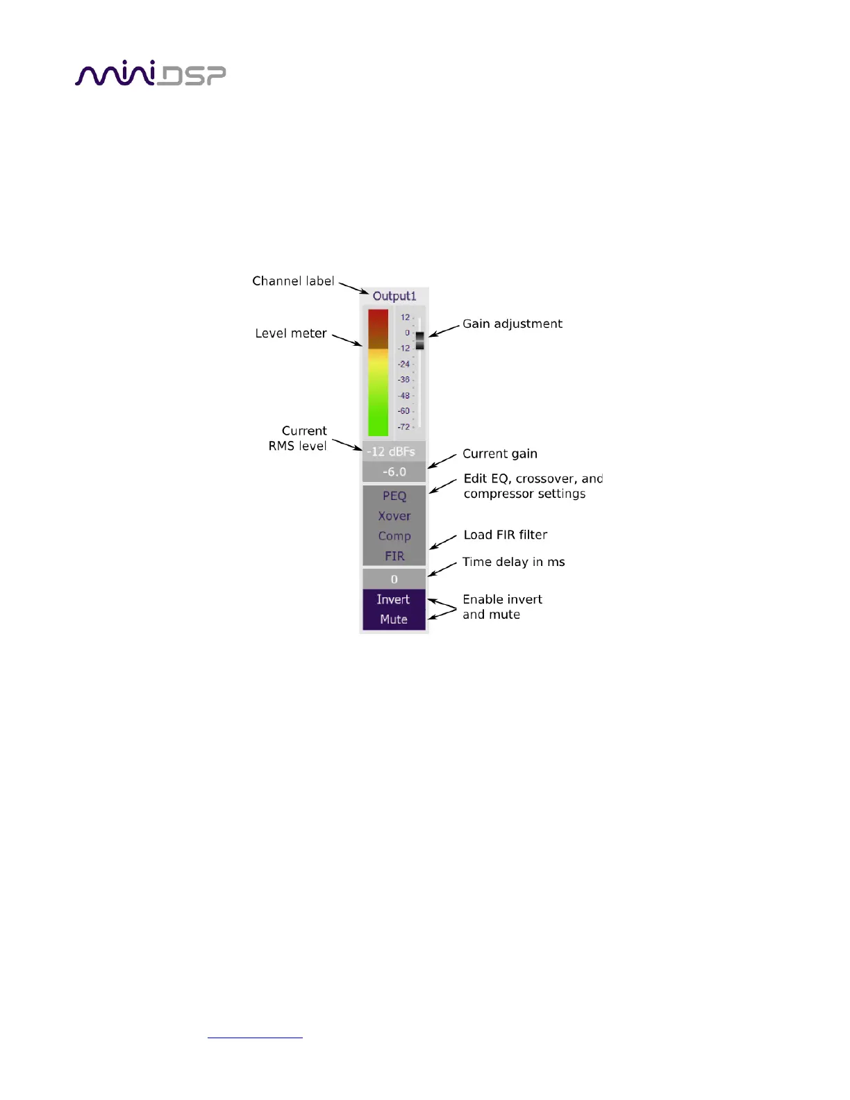 Each output channel has a customizable label, which is shown at the top of the channel strip. This label also